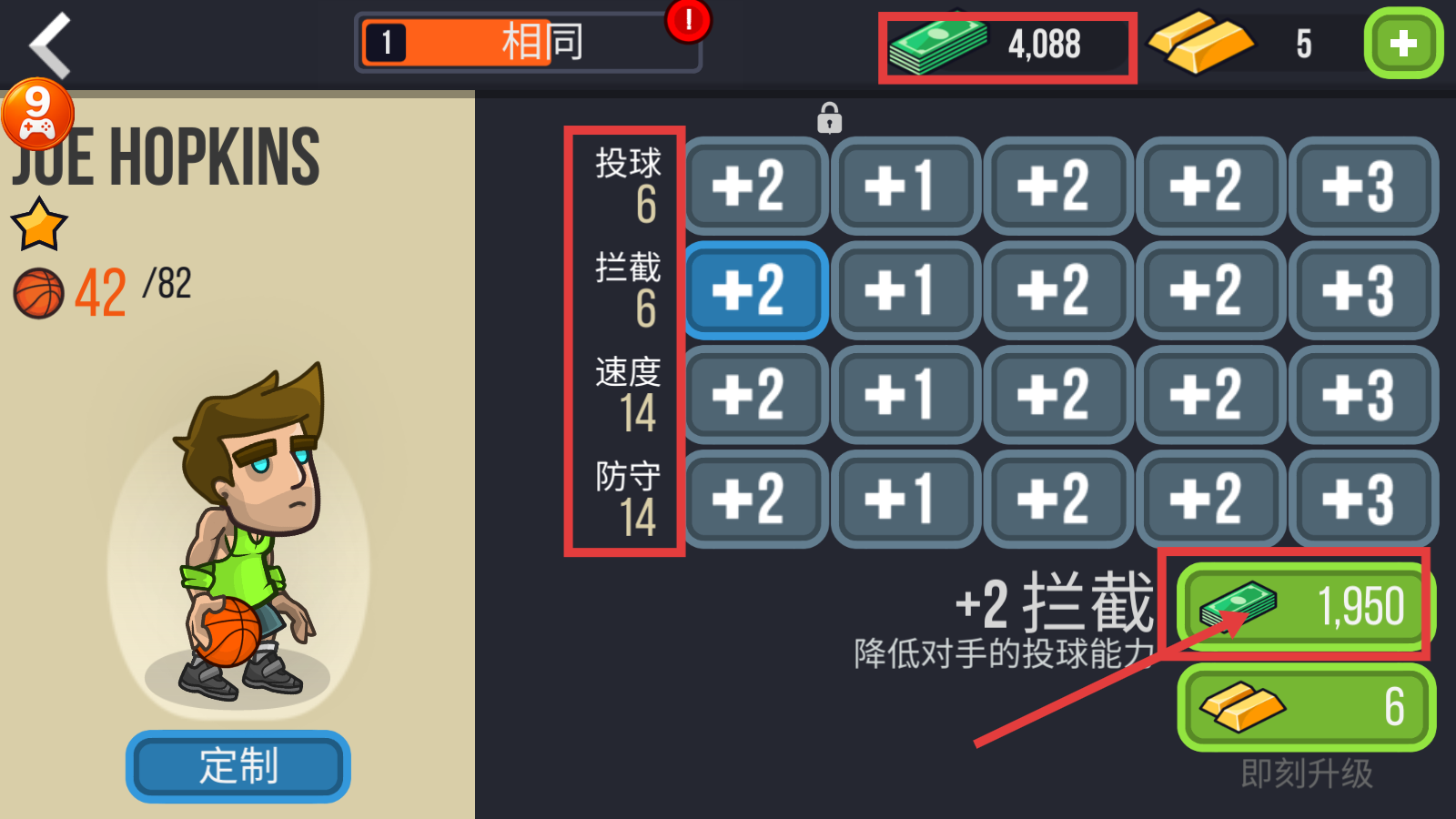 1、使用【4088】金币升级【拦截】属性,降低对手投球能力,增强球员战力,为比赛奠基。