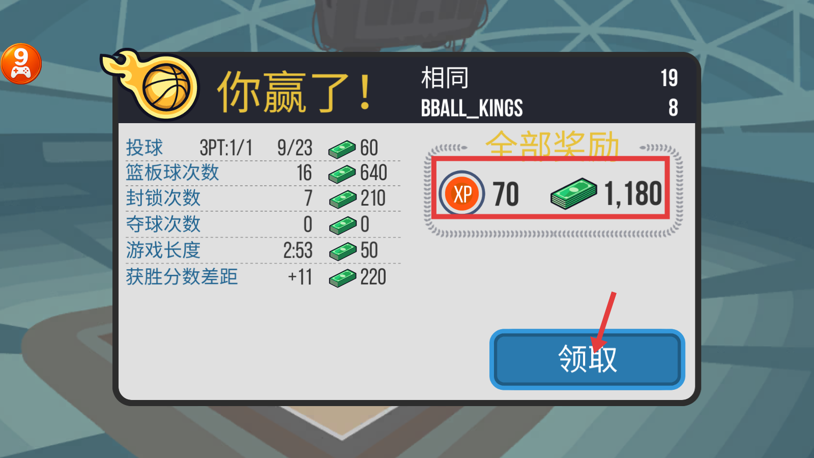 4、获胜后点击【领取】,获取【XP-70】和【1180】金币奖励,积累资源提升球员属性。