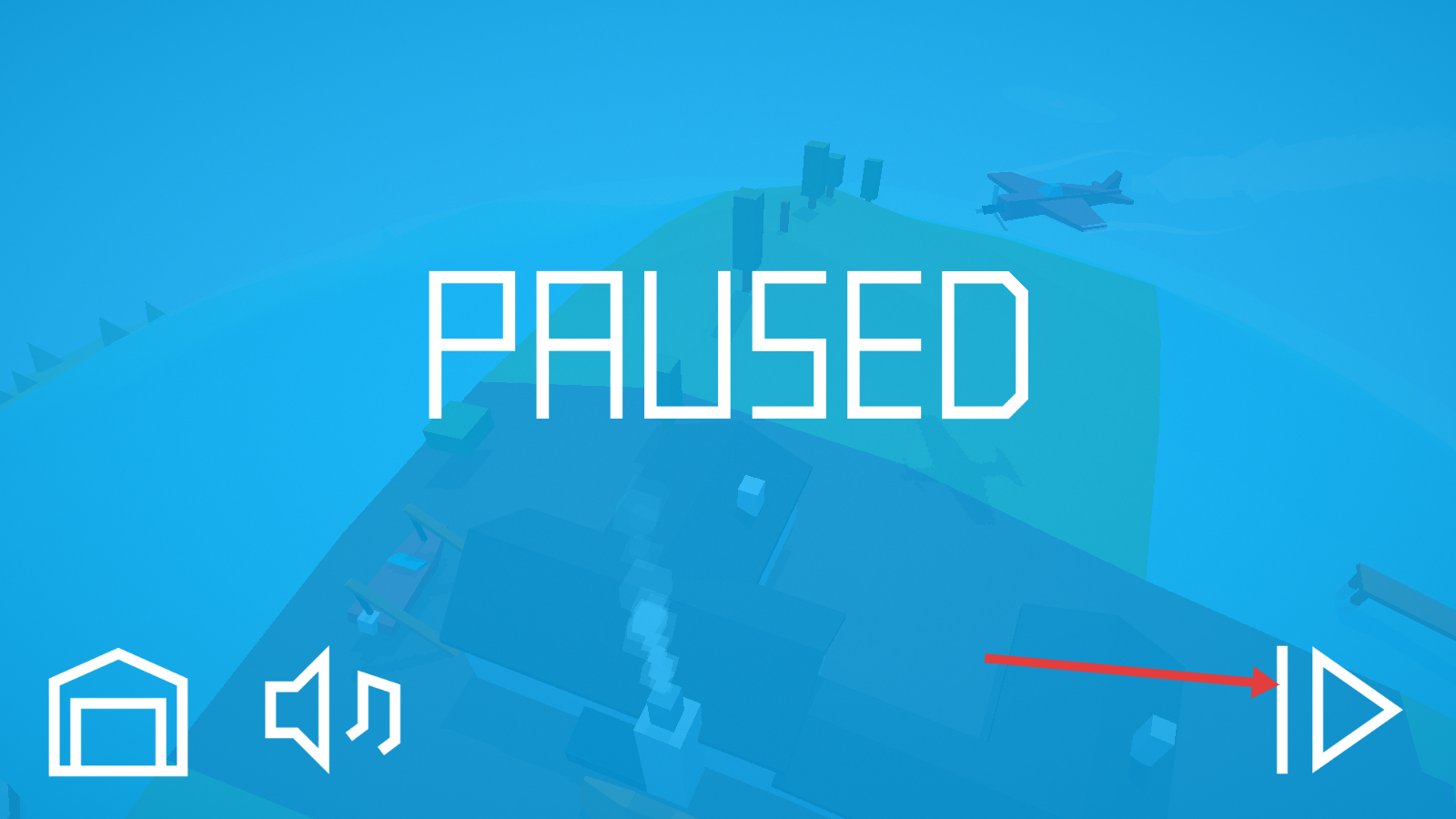 4、在【PAUSED】界面,点击继续按钮恢复游戏,继续操控飞机完成飞行挑战。
