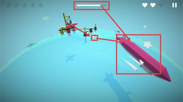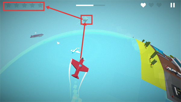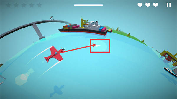 1、操控红色飞机收集【白色标记】,沿航线飞行,注意场景中的船只和桥梁,保持飞行稳定。