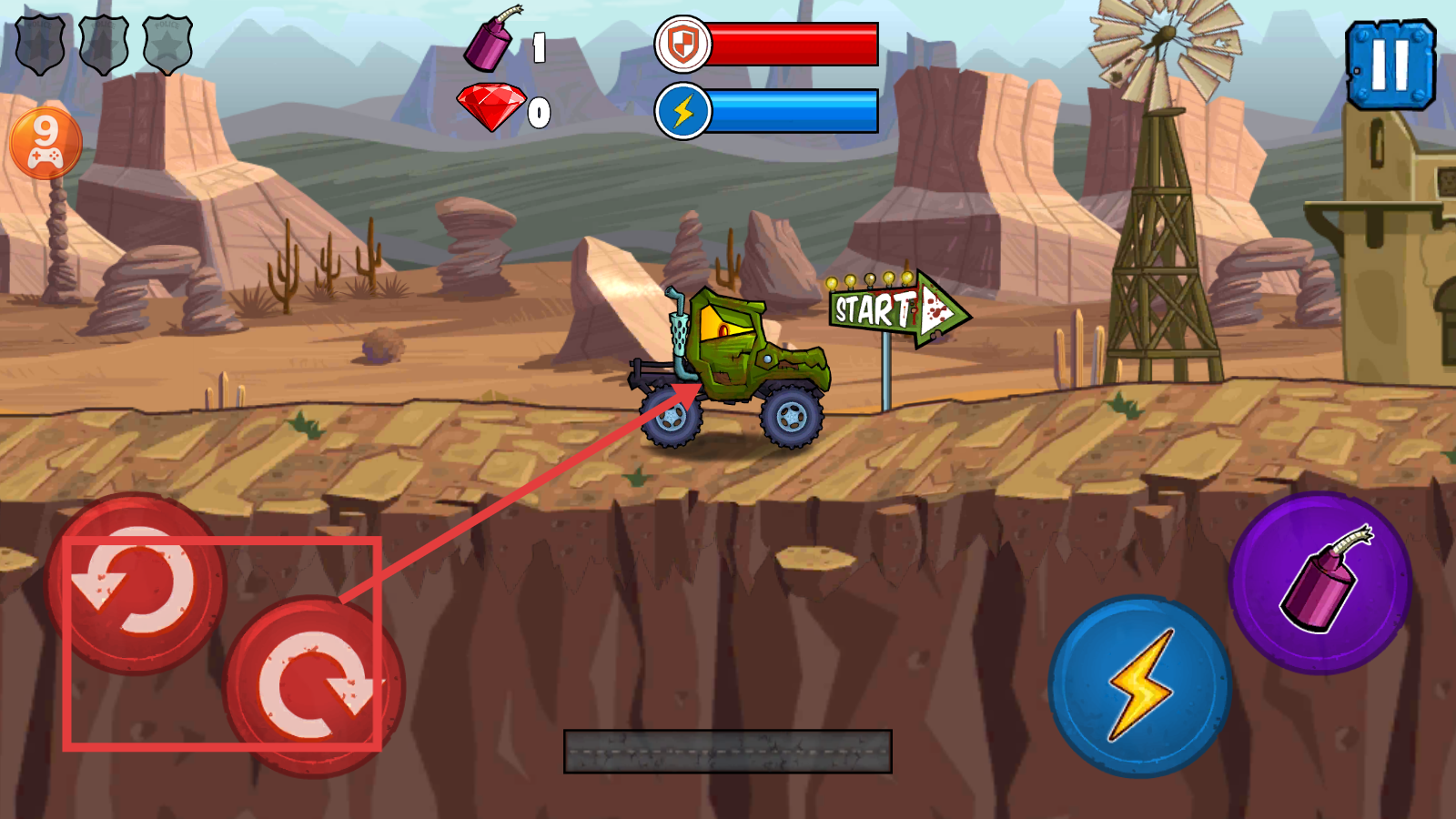 1、操控绿色越野车时,利用左侧红色旋转按钮调整车辆状态,在START标志处准备出发,开启关卡挑战。