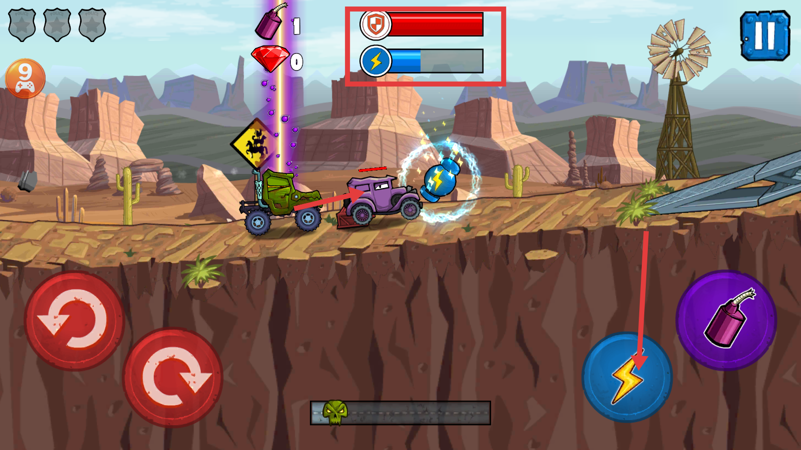 2、战斗中点击蓝色闪电技能按钮,攻击紫色敌方车辆,同时留意上方护盾与能量条,维持车辆战力。