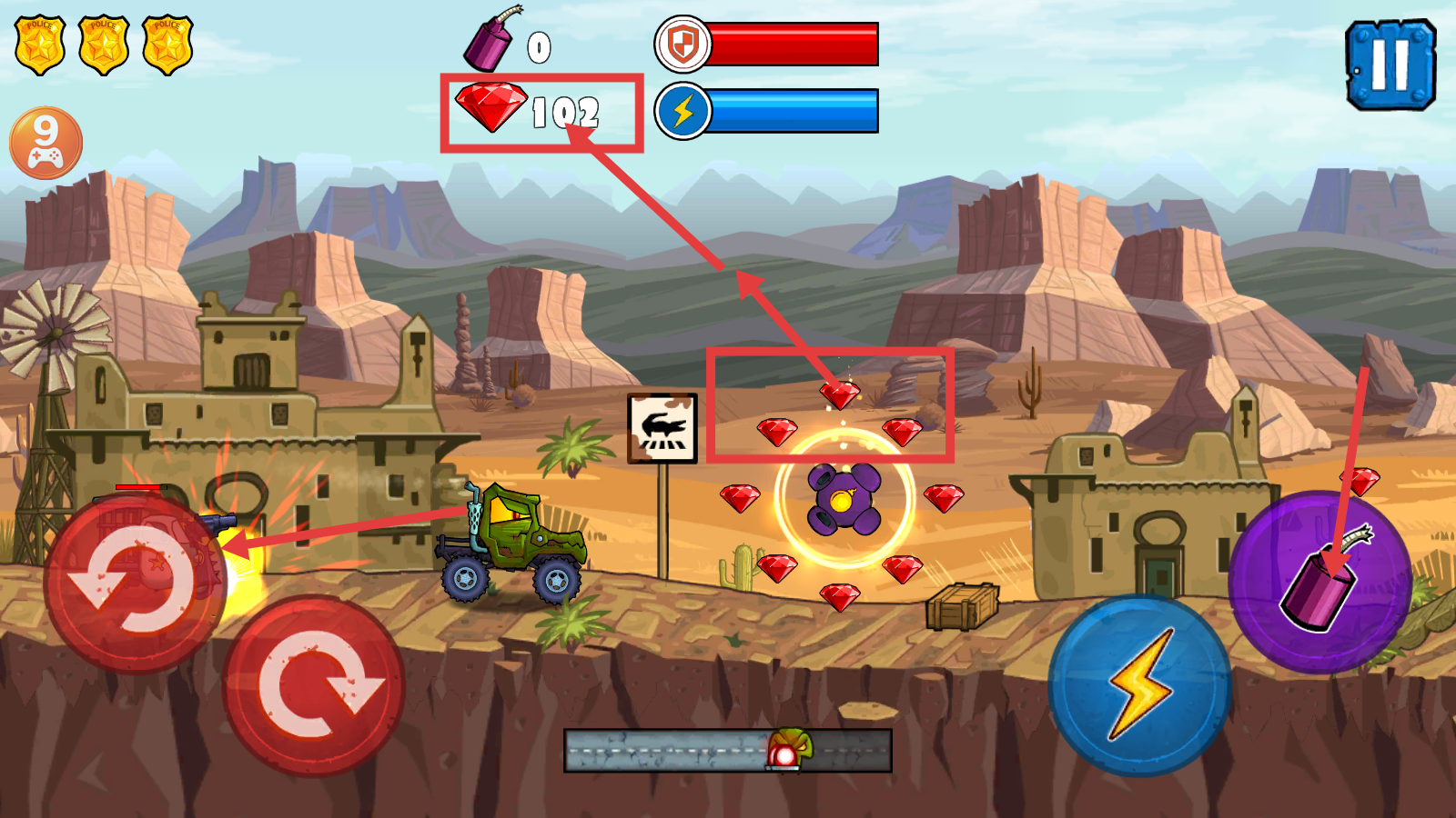 3、探索场景时,积极攻击钻石区域,收集【钻石-102】等资源,积累财富用于车辆升级或道具购买。