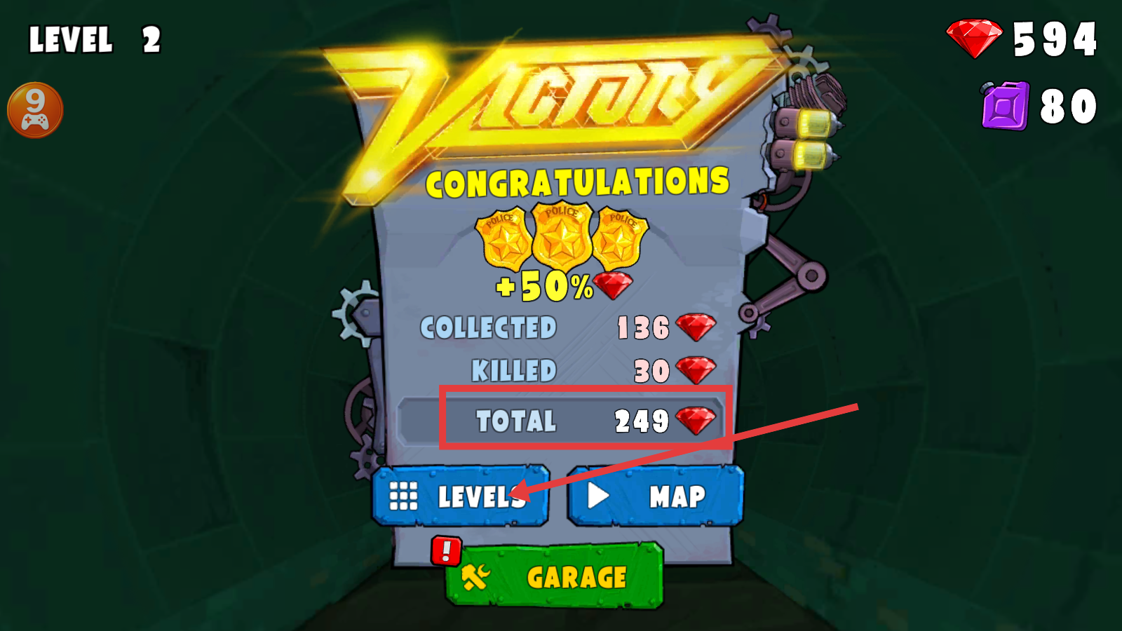 4、关卡胜利后,查看【TOTAL-249】钻石收益,点击【LEVELS】按钮进入下一关,继续挑战获取更多奖励。