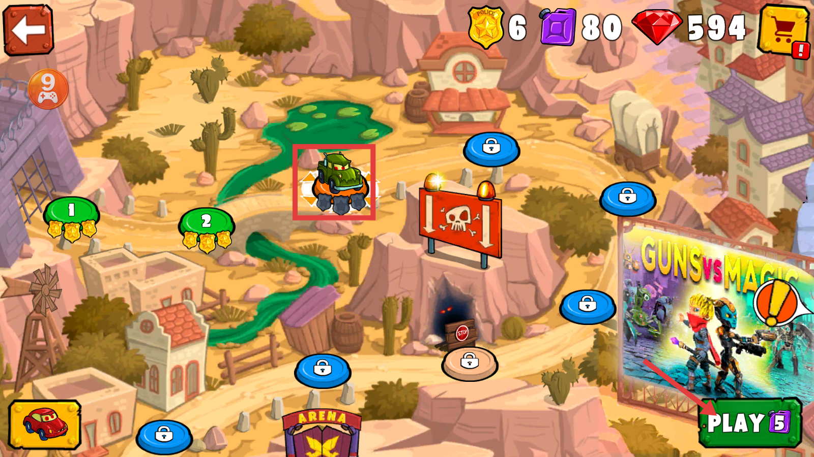 1、在地图界面选择绿色越野车,点击【PLAY-5】进入关卡,按顺序推进以解锁新区域。
