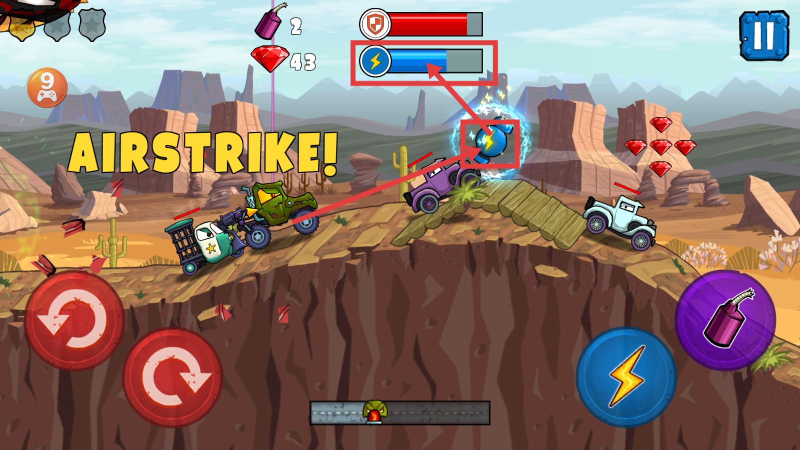 2、战斗时点击蓝色闪电技能按钮攻击敌方车辆,留意【能量条】状态,合理释放技能维持战力。