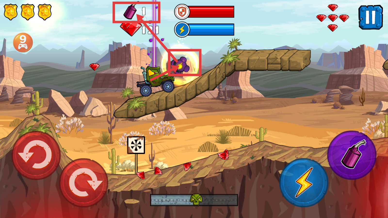 3、探索中收集【紫色炸弹-1】等道具与钻石,利用道具增强车辆能力,积累资源用于升级。