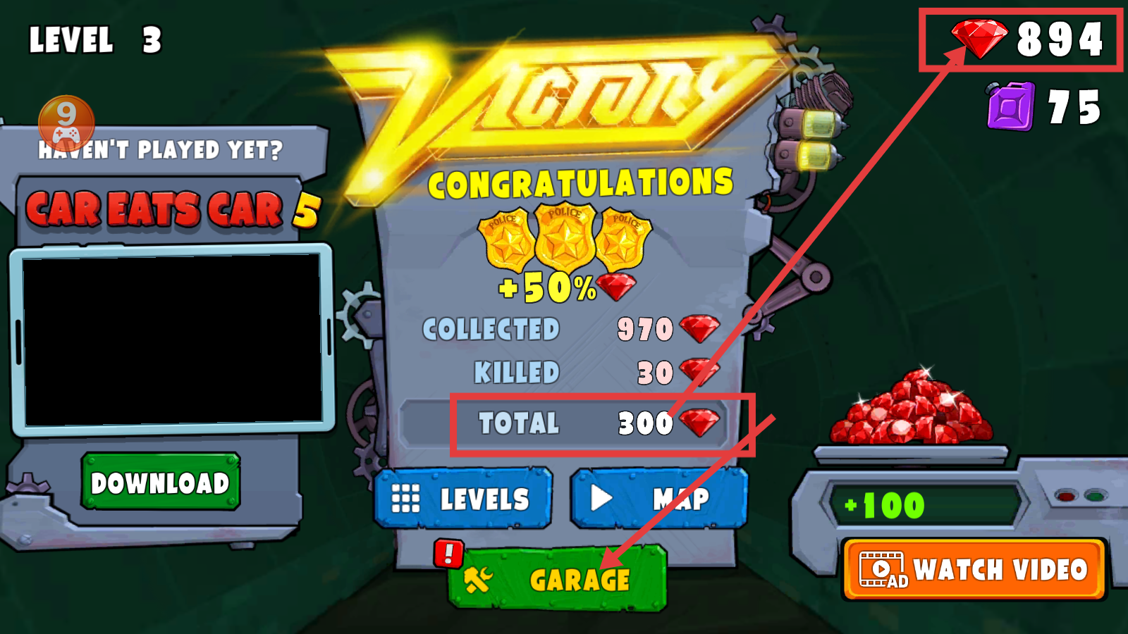 4、关卡胜利后,查看【TOTAL-300】钻石收益,点击【GARAGE】进入车库,可升级车辆或解锁新道具。