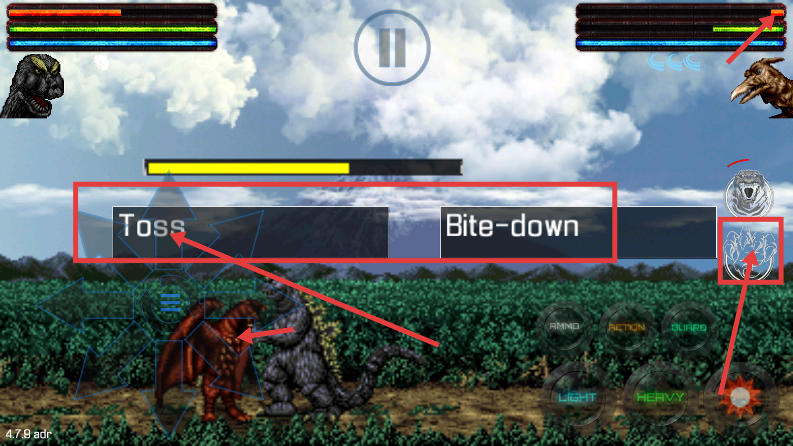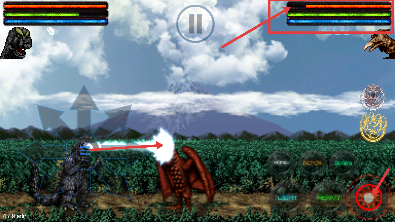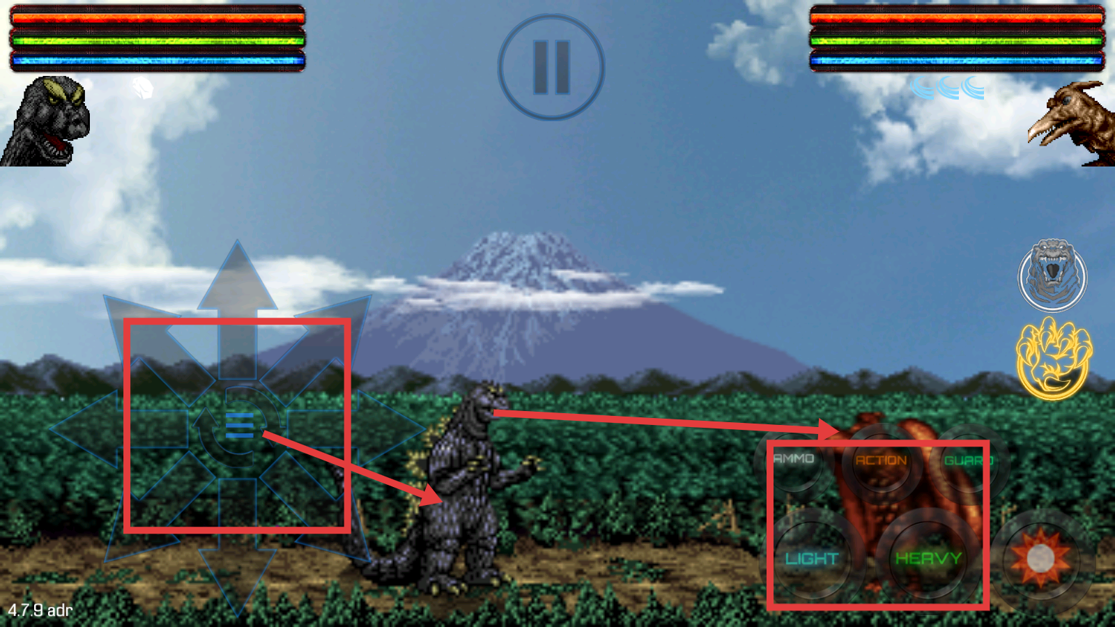 2、战斗时通过左侧虚拟摇杆移动,右侧【LIGHT】【HEAVY】等按钮释放不同攻击,操控哥斯拉与怪兽对决。