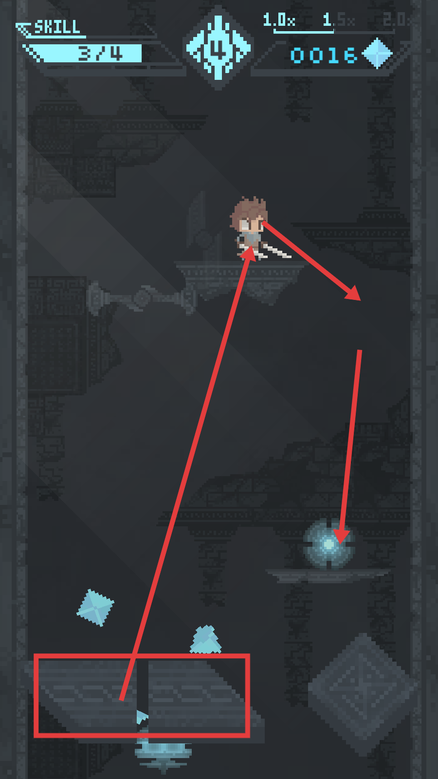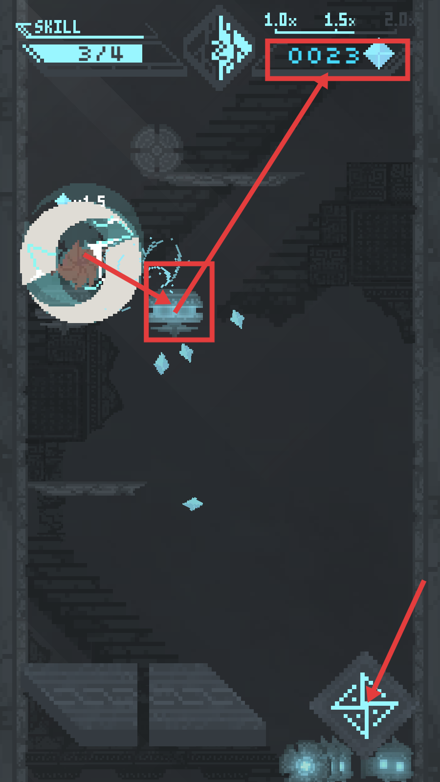3、攻击发光机关收集【钻石-0023】,触发右下角菱形机关,推进关卡进程。
