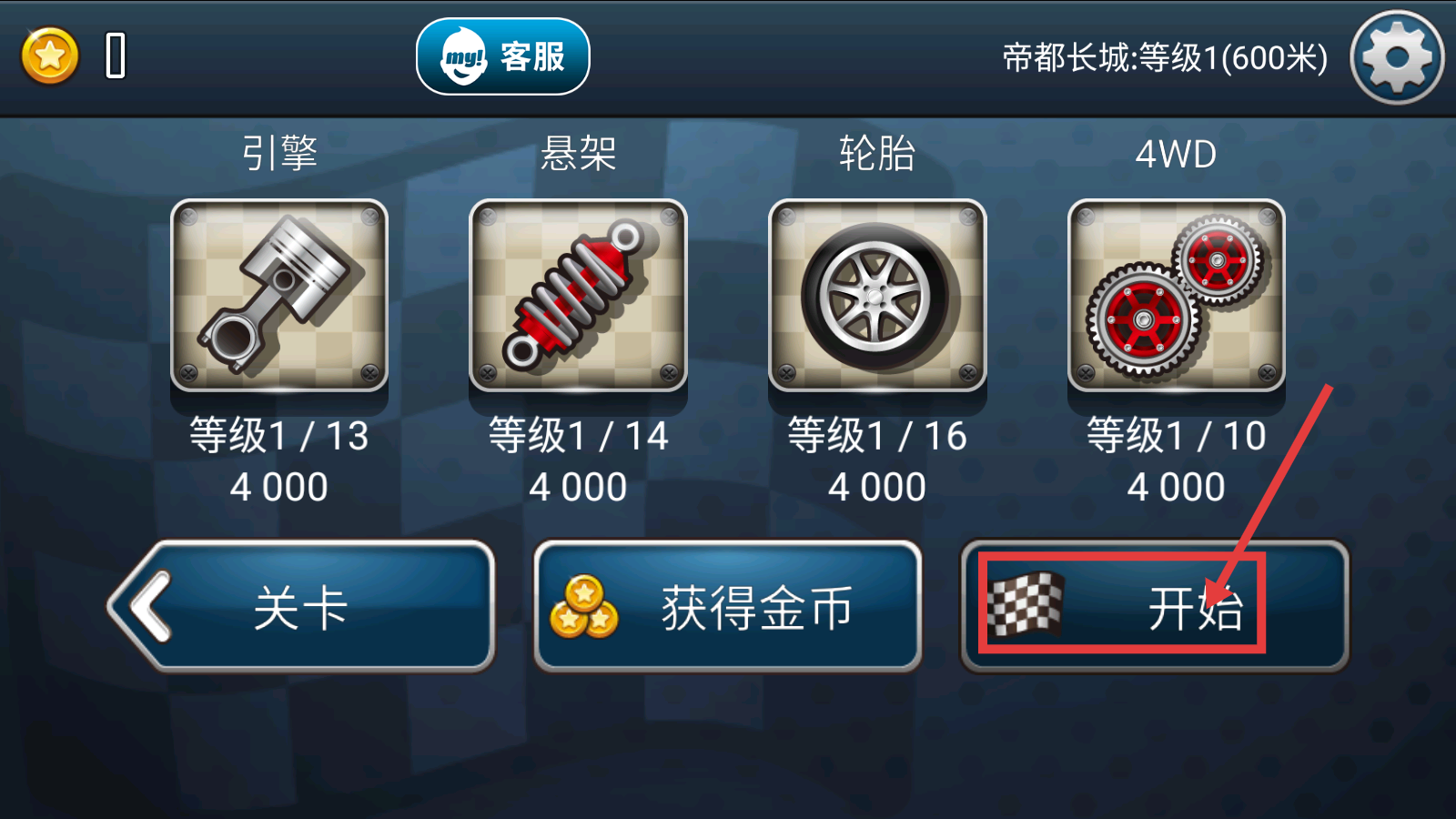 1、点击【开始】按钮,进入【帝都长城-等级1(600米)】关卡,可先了解车辆部件等级,为挑战做好准备。