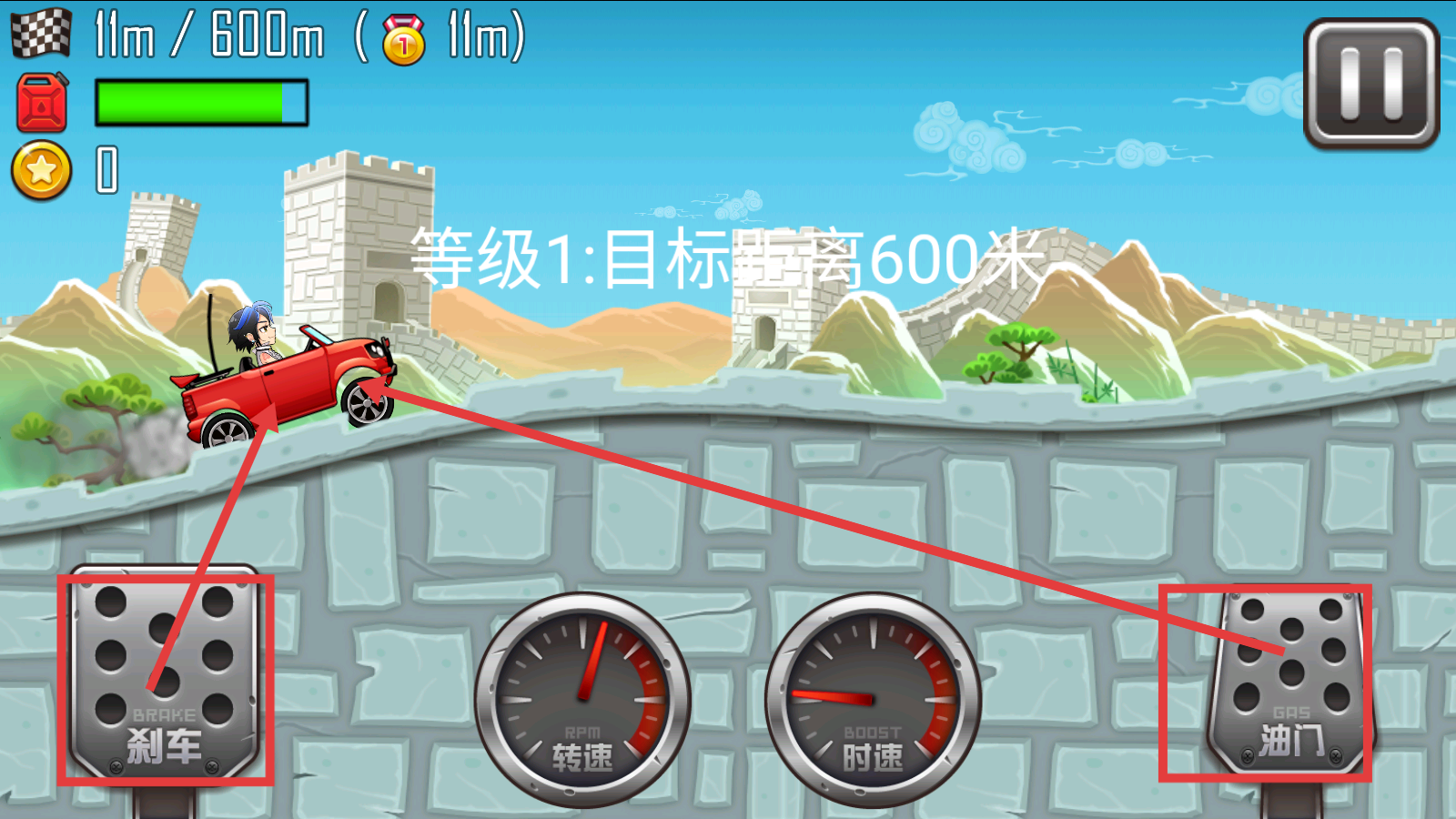 2、驾驶时合理操控【刹车】与【油门】,在长城地形中把控车速,保障车辆平稳前行,完成【等级1-目标距离600米】。