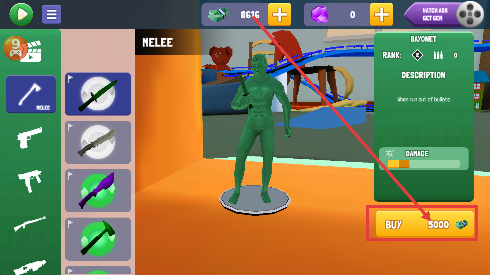 1、进入商店界面,消耗【8616-金钱】点击【BUY-5000-按钮】购买【BAYONET】近战武器,提升近战战斗能力,应对弹药用尽的情况。