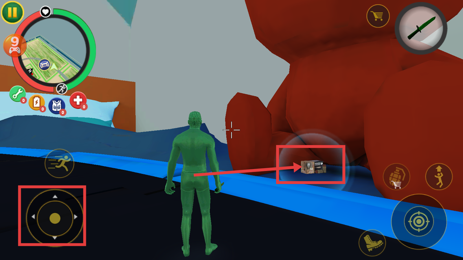 2、利用左下角【移动摇杆】操控角色移动,探索卧室风格场景,收集道具箱,熟悉场景中的互动元素。