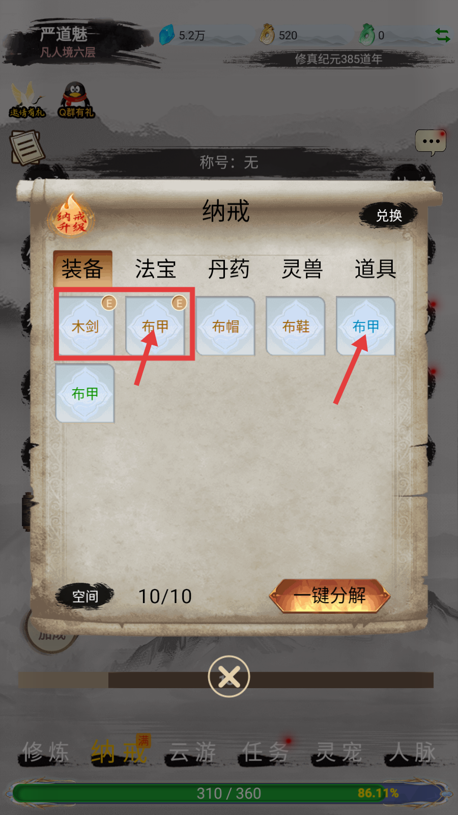 2、打开【纳戒】,穿戴【木剑】【布甲】等装备,提升角色战力,装备是修仙途中增强实力的关键手段。