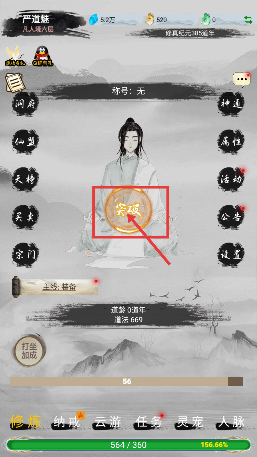 3、当修为足够时,点击【突破】按钮,尝试突破境界,突破是提升修仙等级的核心操作,可大幅增强道法。
