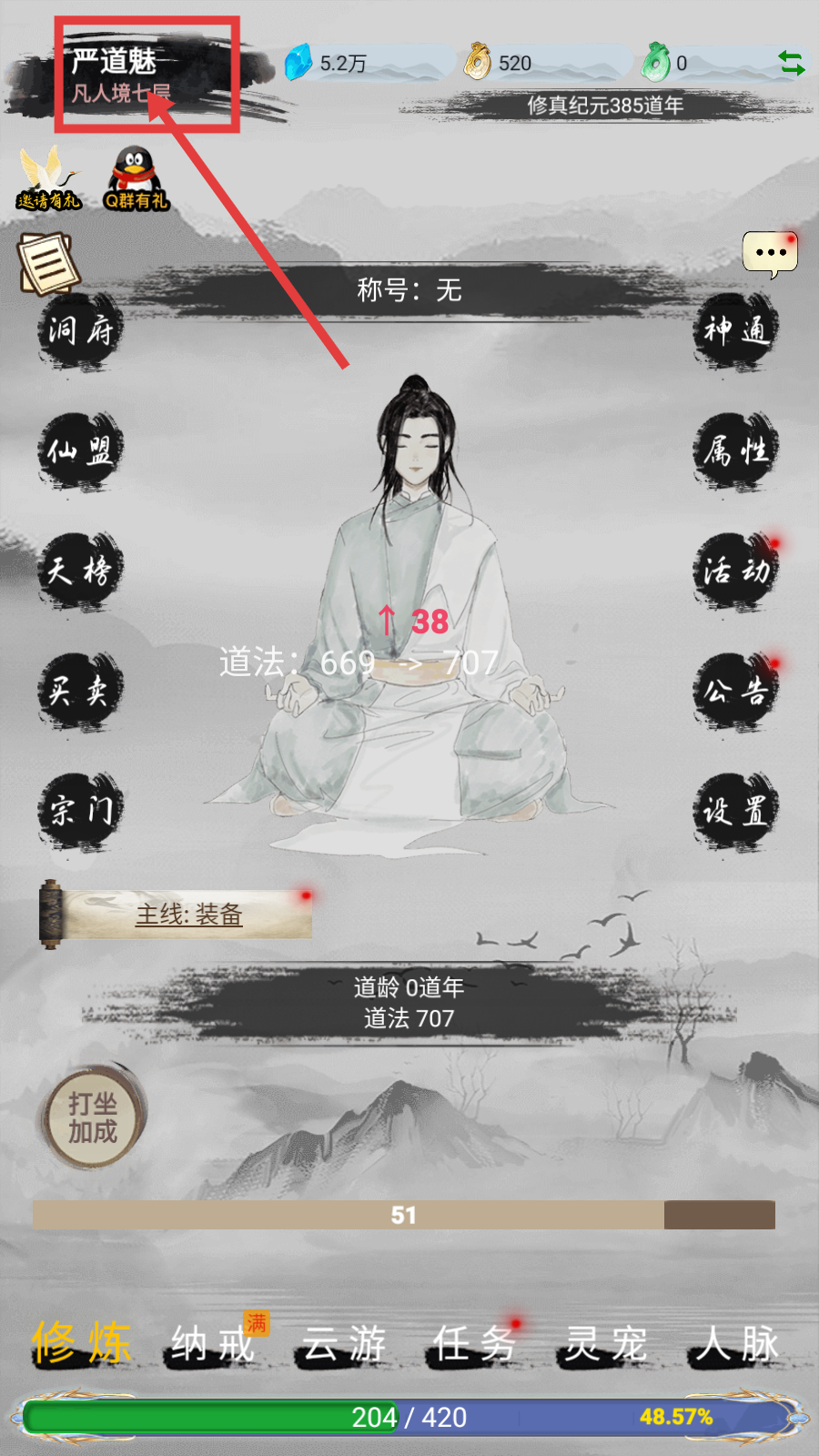 4、成功突破后,角色境界提升至【凡人境七层】,道法从669提升至707,持续突破可不断提升修仙境界与实力。