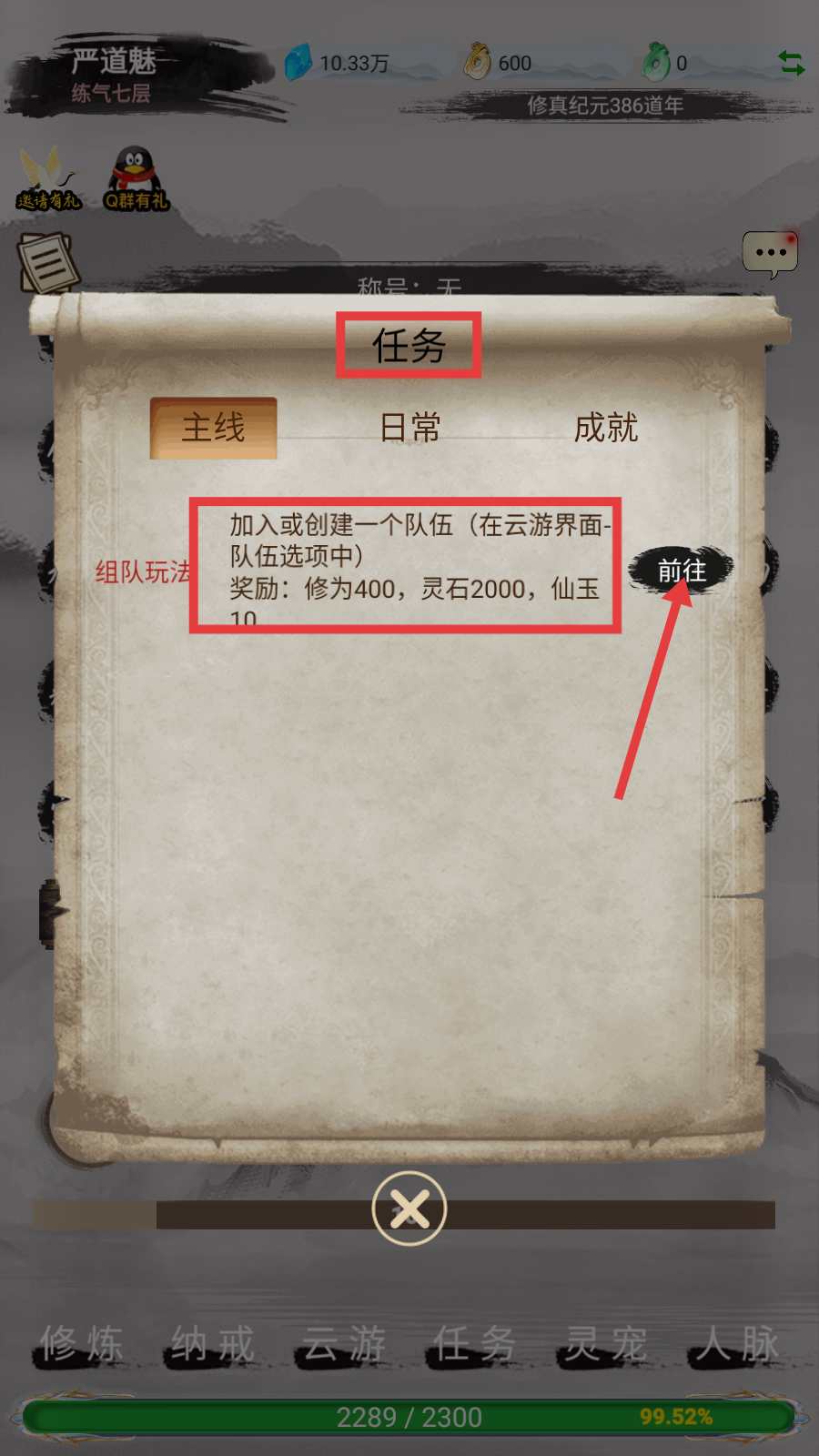 1、在【任务-主线】中,点击【前往】完成加入或创建队伍任务,可获得【修为400-灵石2000-仙玉10】奖励,助力修仙进程。