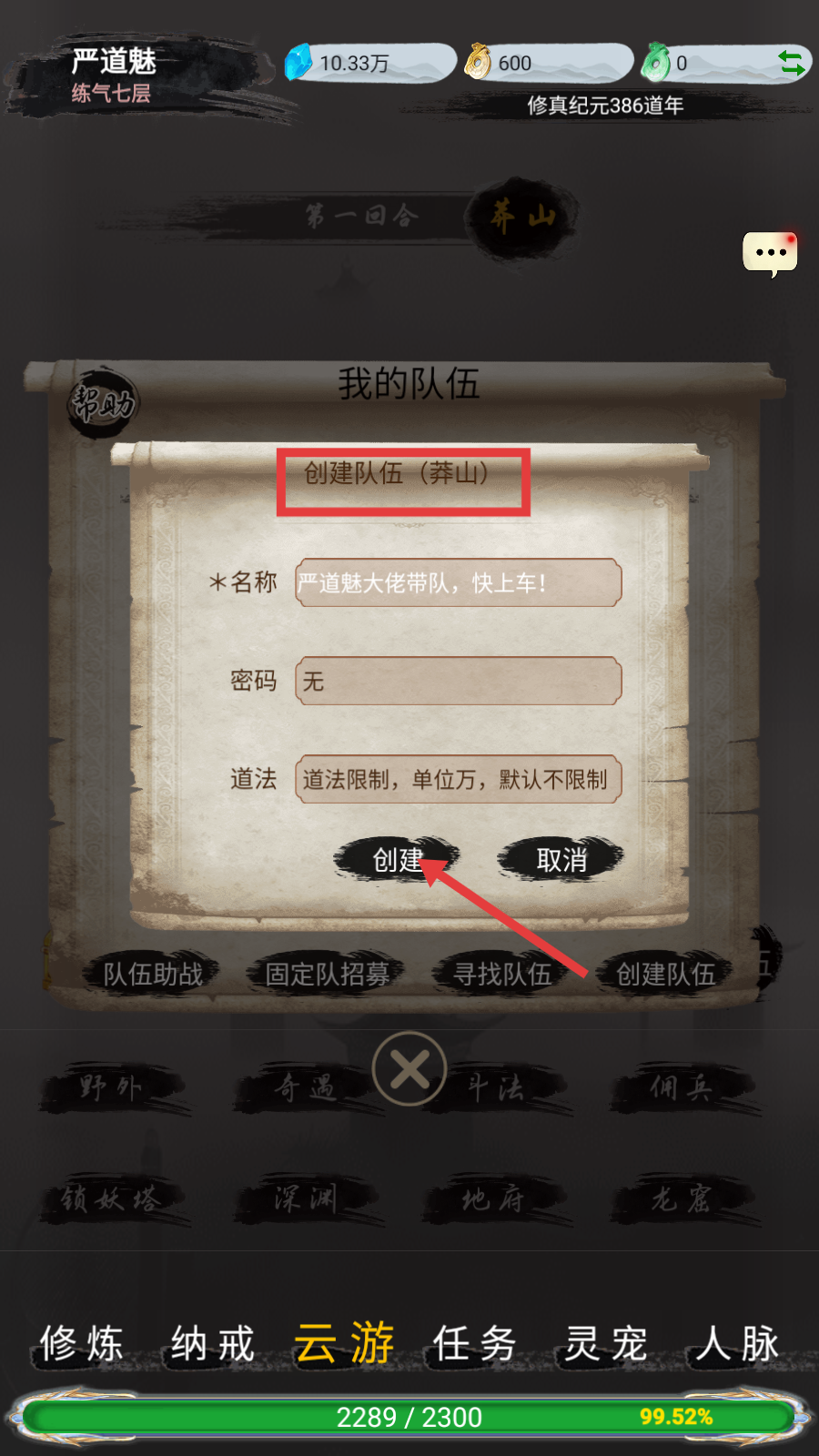 2、在云游界面的队伍选项中,选择【创建队伍(莽山)】,设置队伍名称等信息后点击【创建】,组建自己的修仙队伍。