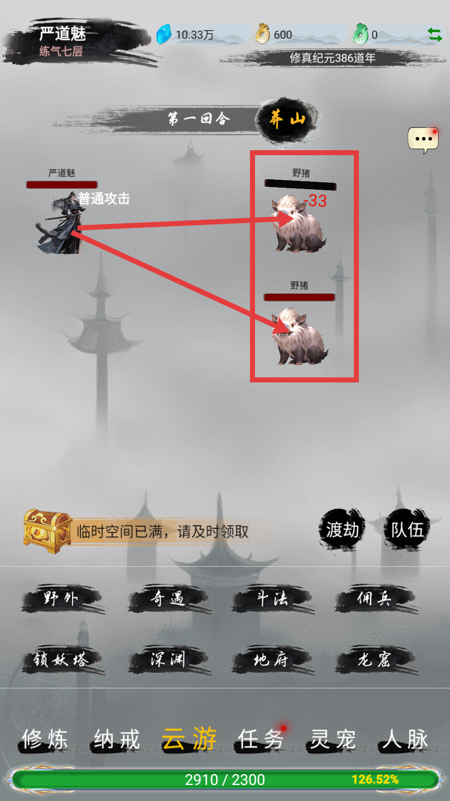 3、进入莽山战斗,使用普通攻击对战【野猪】怪物,合理操作角色发起攻击,推进战斗进程。
