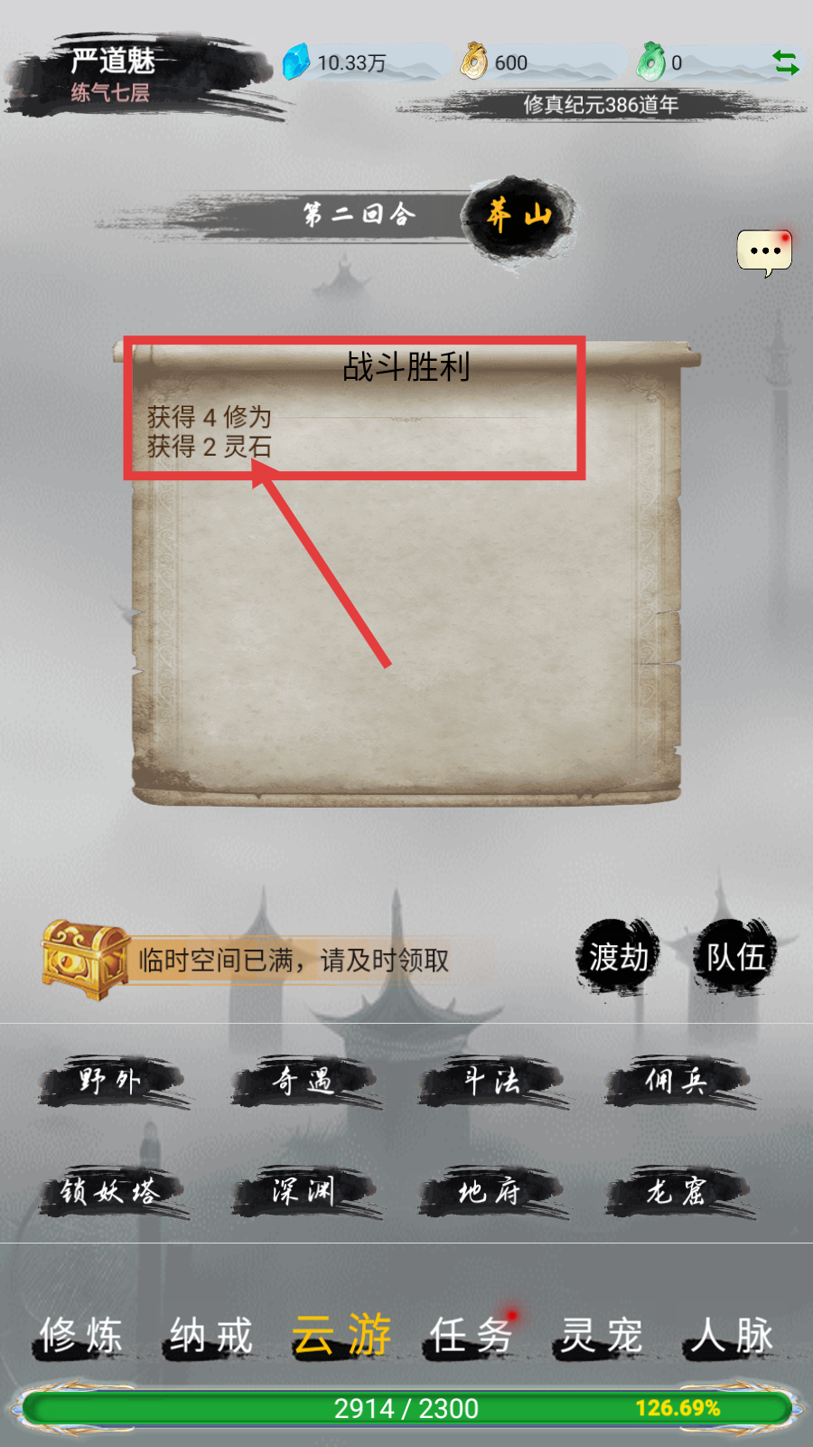 4、战斗胜利后,可获得【4-修为】和【2-灵石】,积累资源用于提升角色实力,继续修仙之旅。