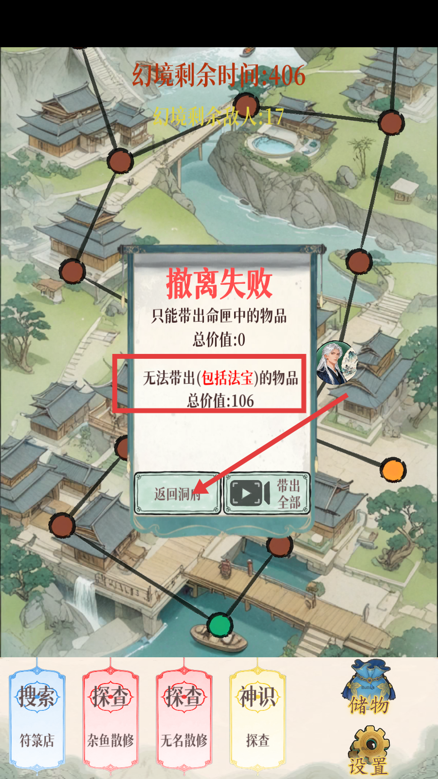 4、若出现【撤离失败】,仅能带出命匣物品,价值过高时谨慎撤离,可选择【返回洞府】重新规划资源与探索策略。