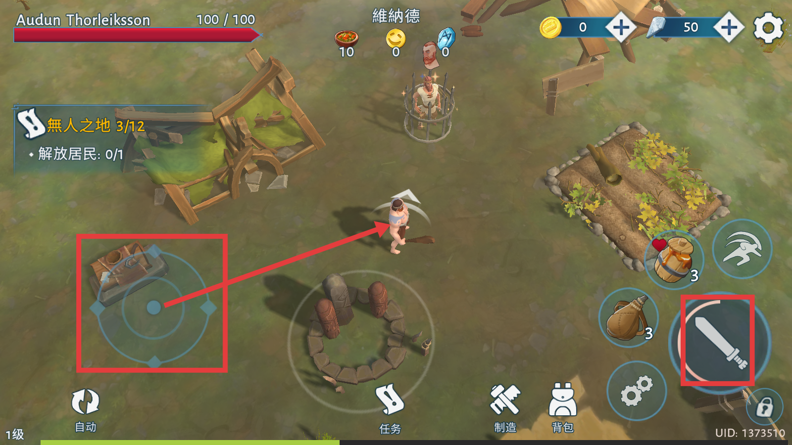 1、通过左下角移动摇杆操控角色移动,右下角攻击键可发起攻击。关注“无人之地3/12”任务,目标是解放居民。