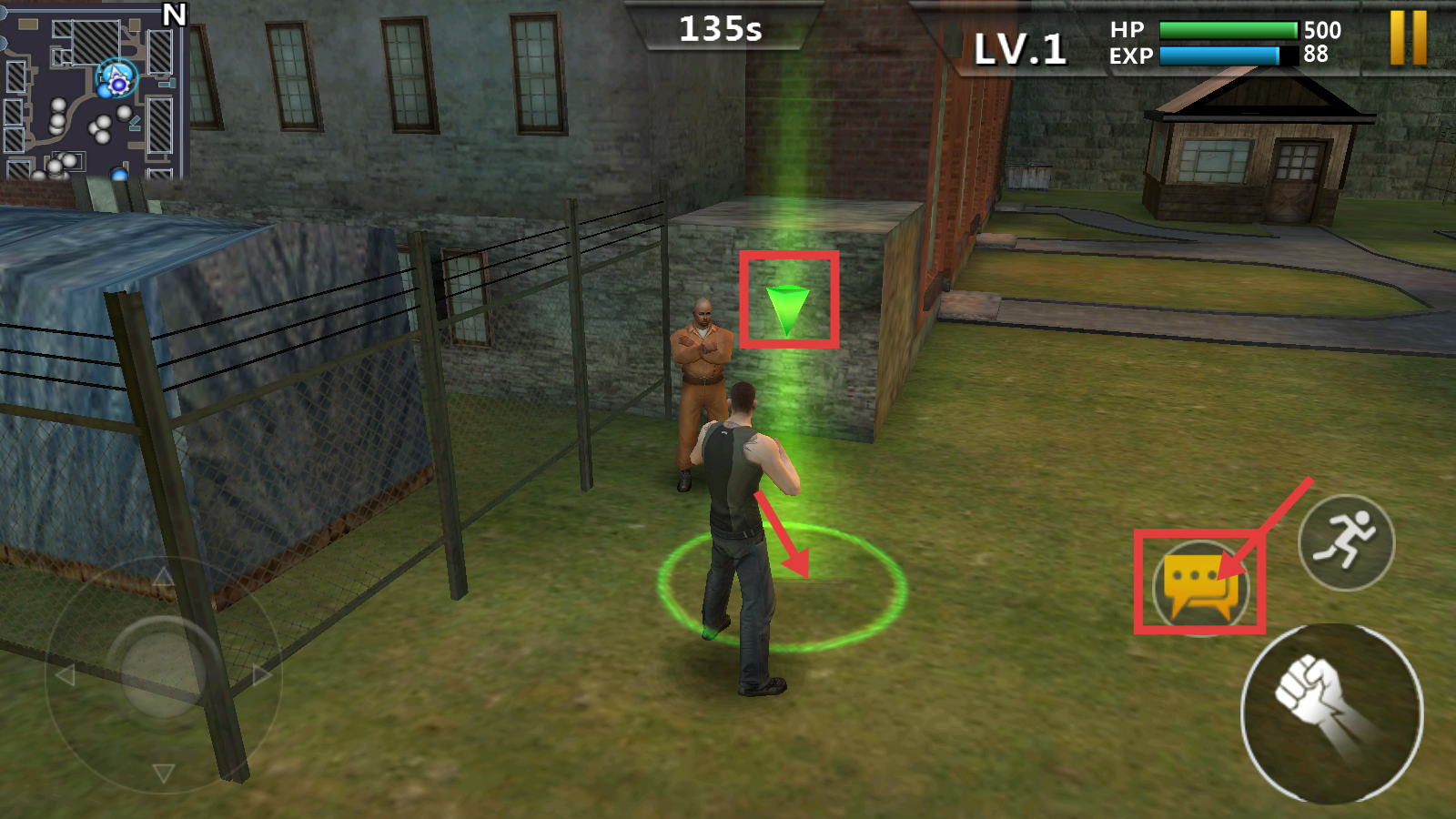 1、通过左下角移动摇杆操控角色移动,熟悉监狱场景环境。关注右上角LV.1、HP(500)、EXP(88)等信息,了解角色状态。