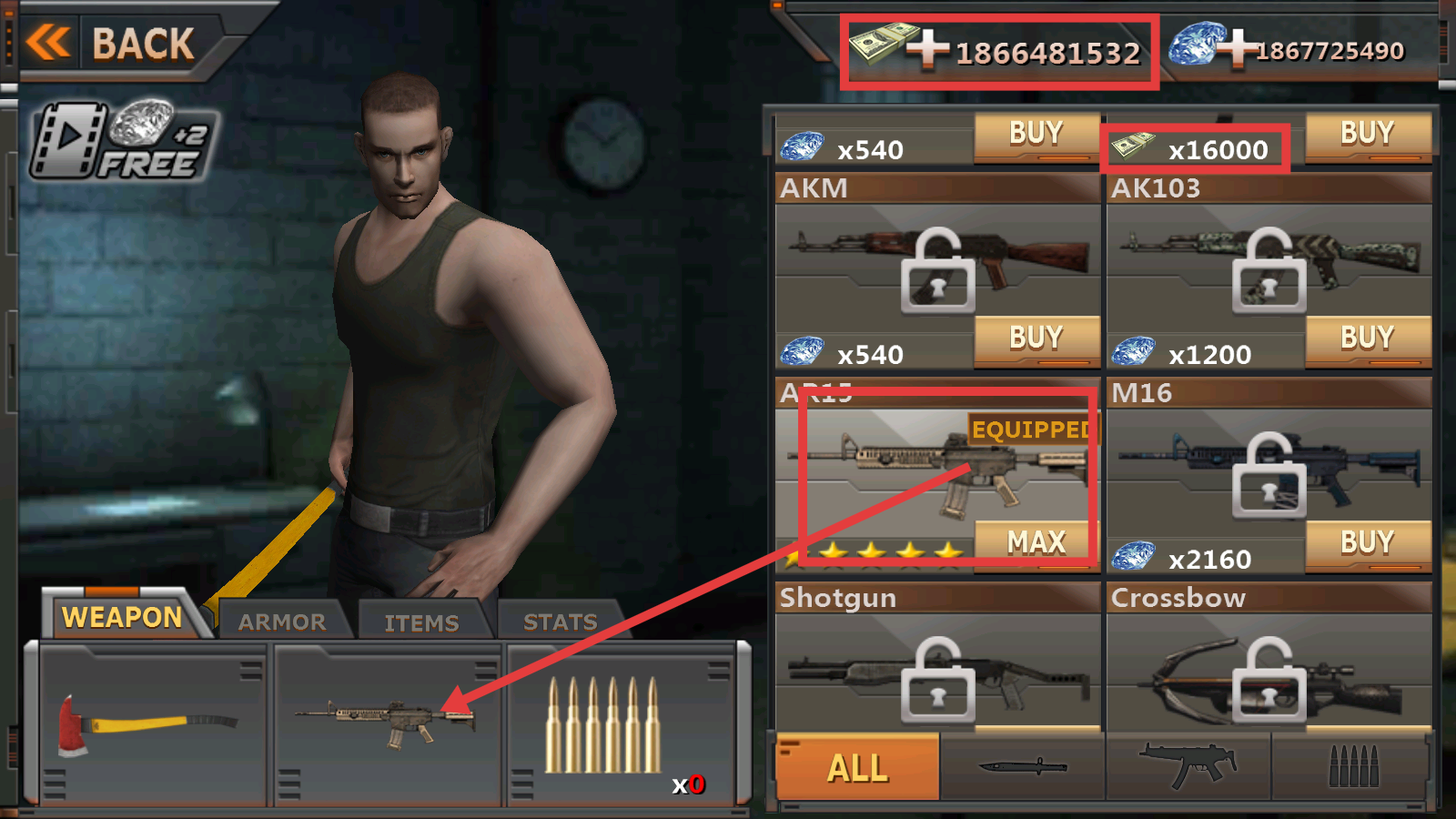 1、在武器界面,可利用大量金钱和钻石资源,选择并装备强力武器以提升战斗能力,不同武器有不同解锁条件,需合理规划资源。