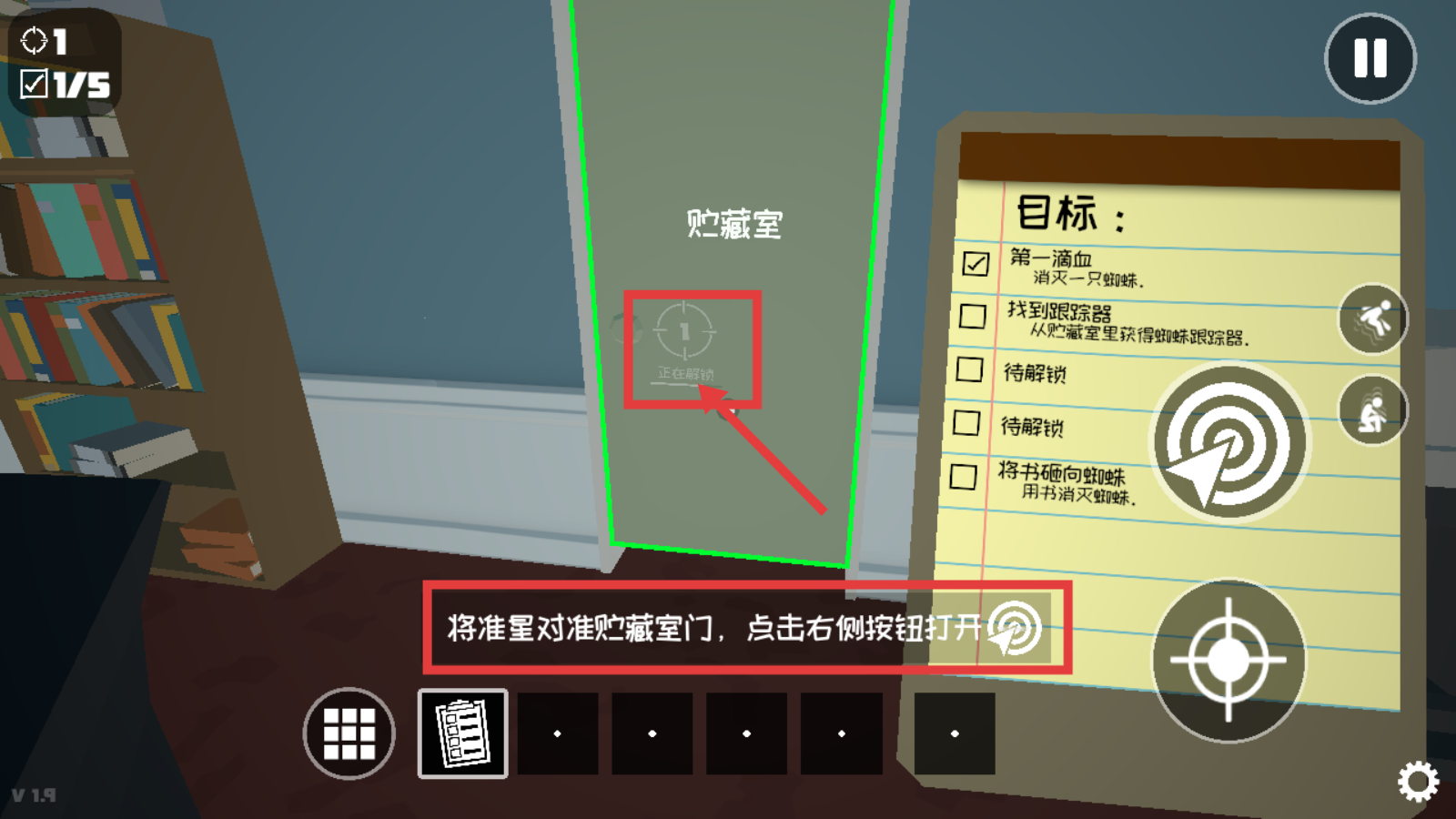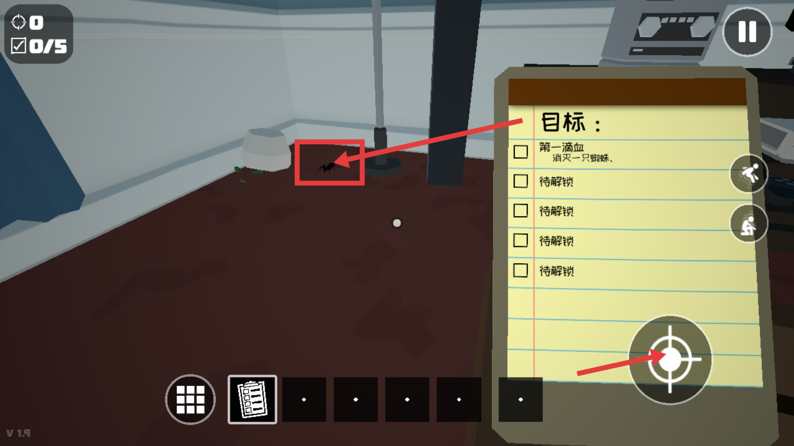 1、瞄准蜘蛛,点击右侧攻击按钮,完成【第一滴血-消灭一只蜘蛛】的任务,推进游戏进度。