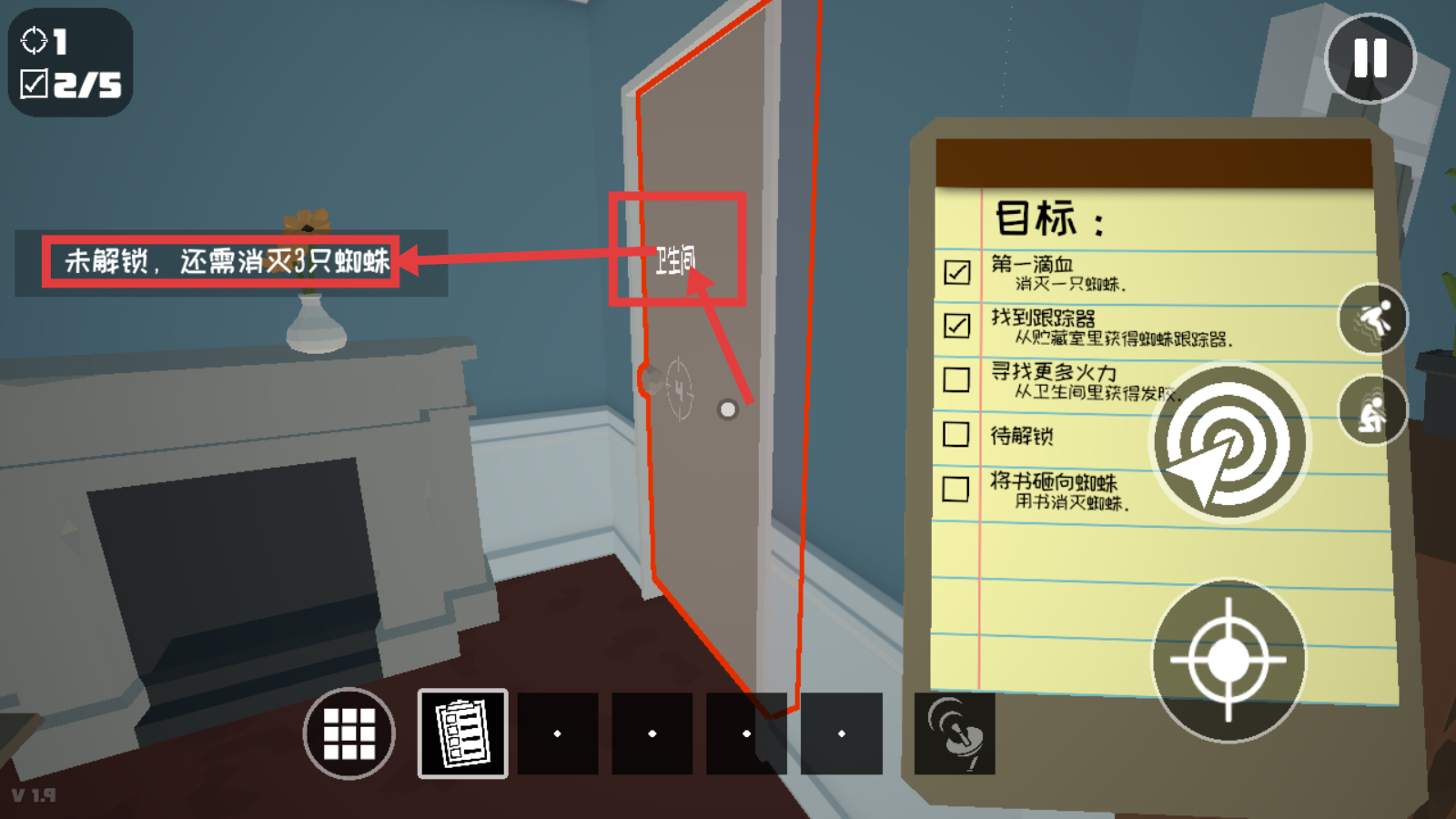 2、卫生间需消灭【3-只蜘蛛】才能解锁,优先积累灭蛛数量,为获取发胶创造条件。