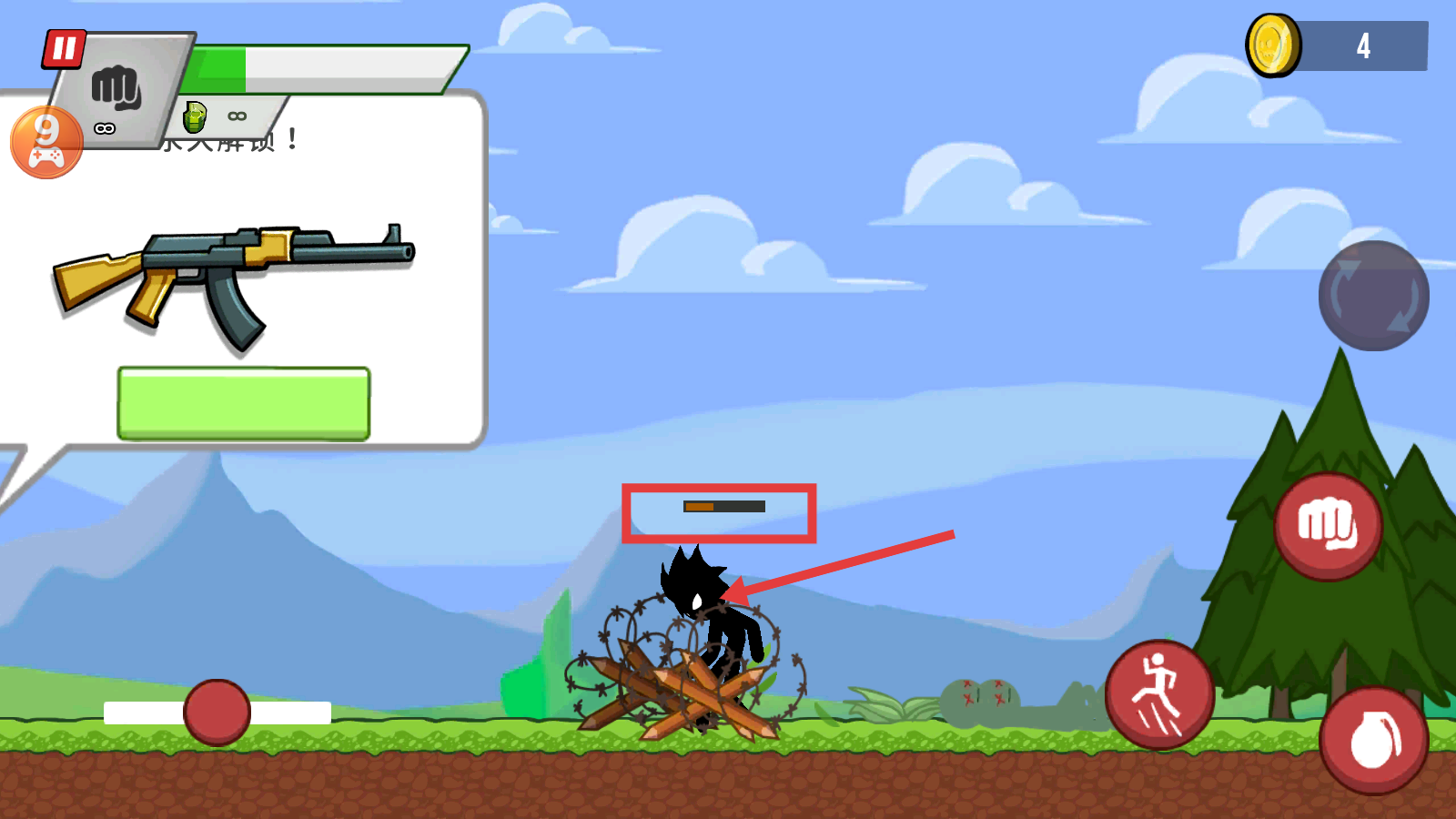3、避开陷阱,获取【AK-步枪】永久解锁,提升战斗能力,积累金币【4-枚】。