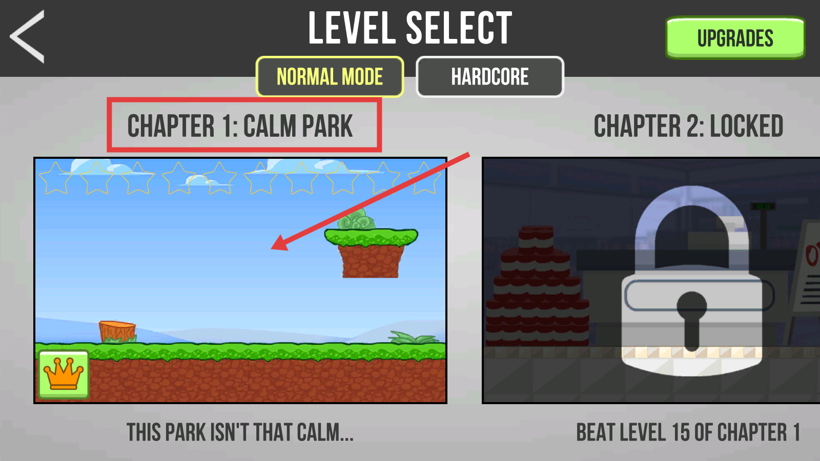 1、选择【NORMAL-MODE】下的【CHAPTER-1:CALM-PARK】,进入第一章平静公园关卡,开启冒险。