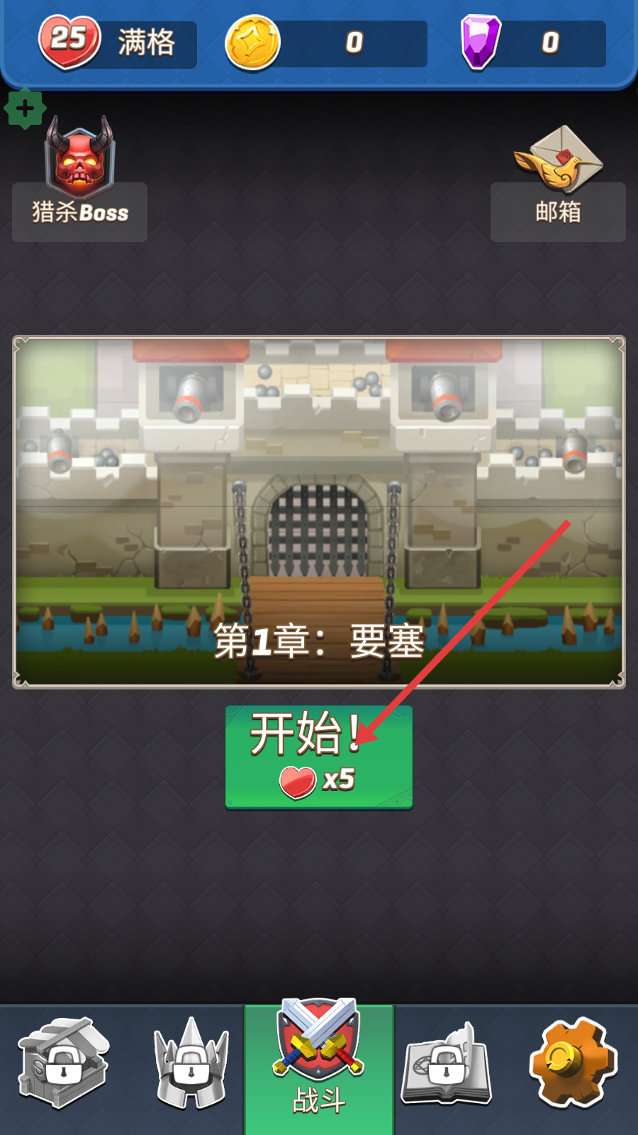 1、点击【开始!-生命值x5】进入【第1章:要塞】,开启战斗前确保了解章节目标,合理利用爱心资源推进。