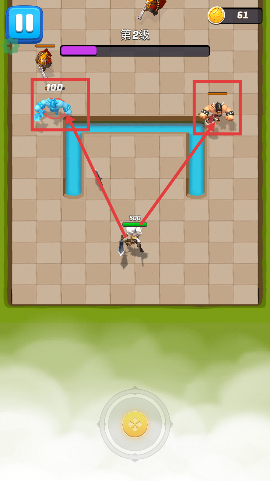 2、战斗中留意不同敌人血量,如【100】血的蓝色敌人和其他敌人,优先规划攻击顺序,高效积累金币。