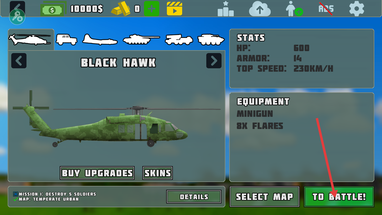 1、选择【BLACKHAWK】直升机,确认其【HP-600】【ARMOR-14】【TOPSPEED-230KM/H】属性后,点击【TOBATTLE!】进入战斗。