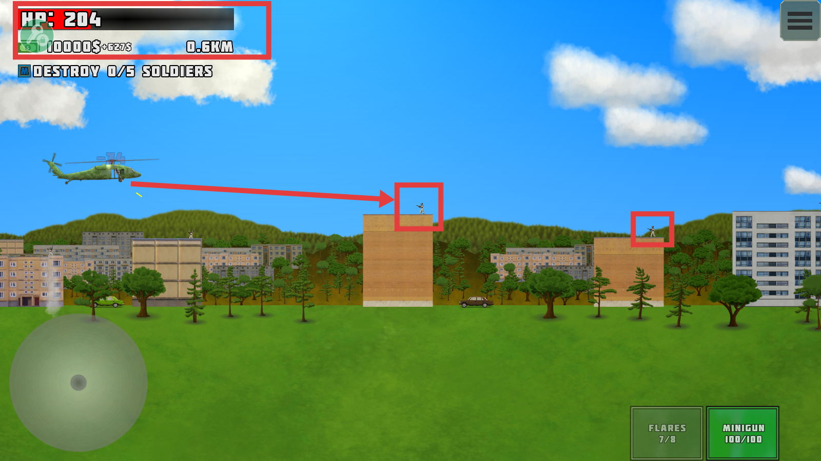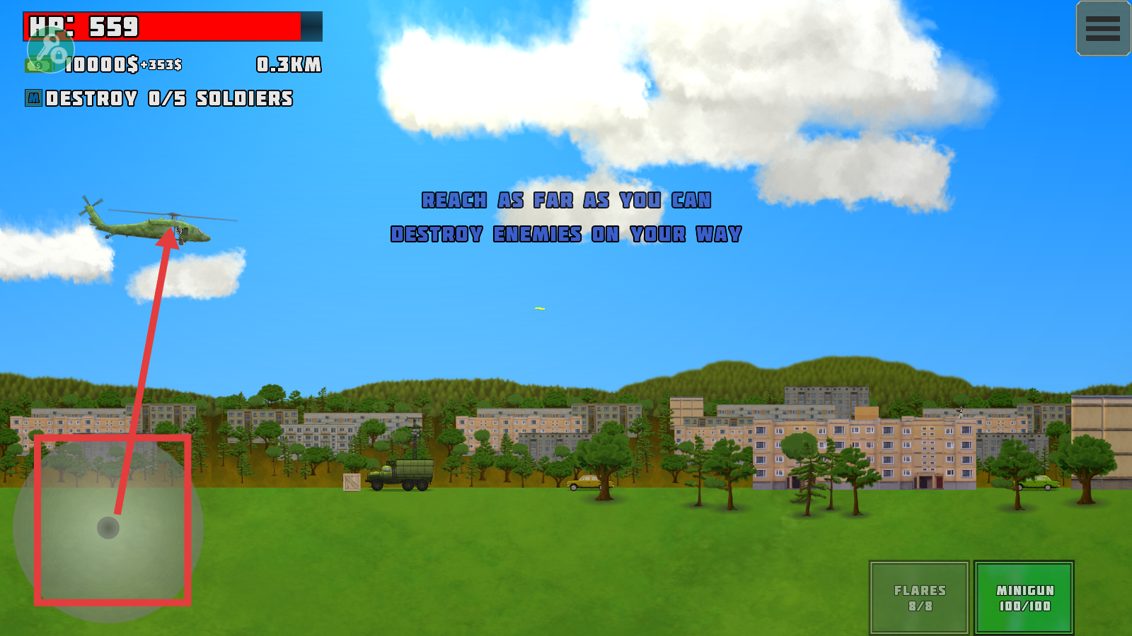 2、操控直升机时,通过左下角控制区域移动,关注【HP-559】,推进距离并完成【DESTROY0/5SOLDIERS】任务。