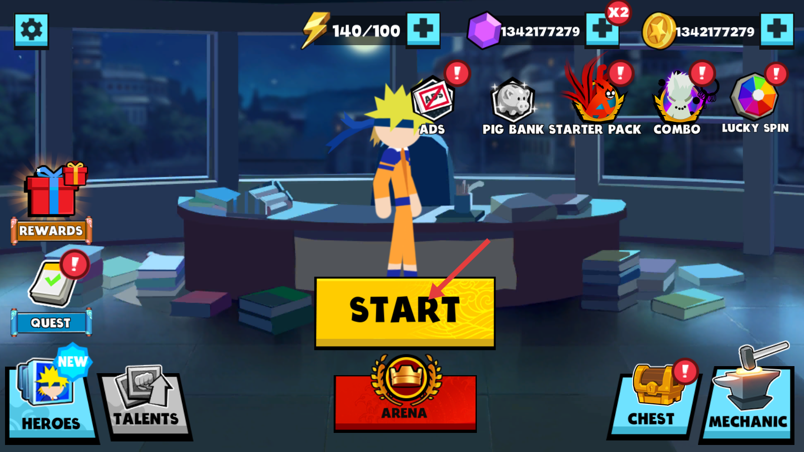 1、点击【START】开始游戏,可先查看【REWARDS】【QUEST】等功能,利用资源推进游戏进程,熟悉界面功能后再进入战斗。