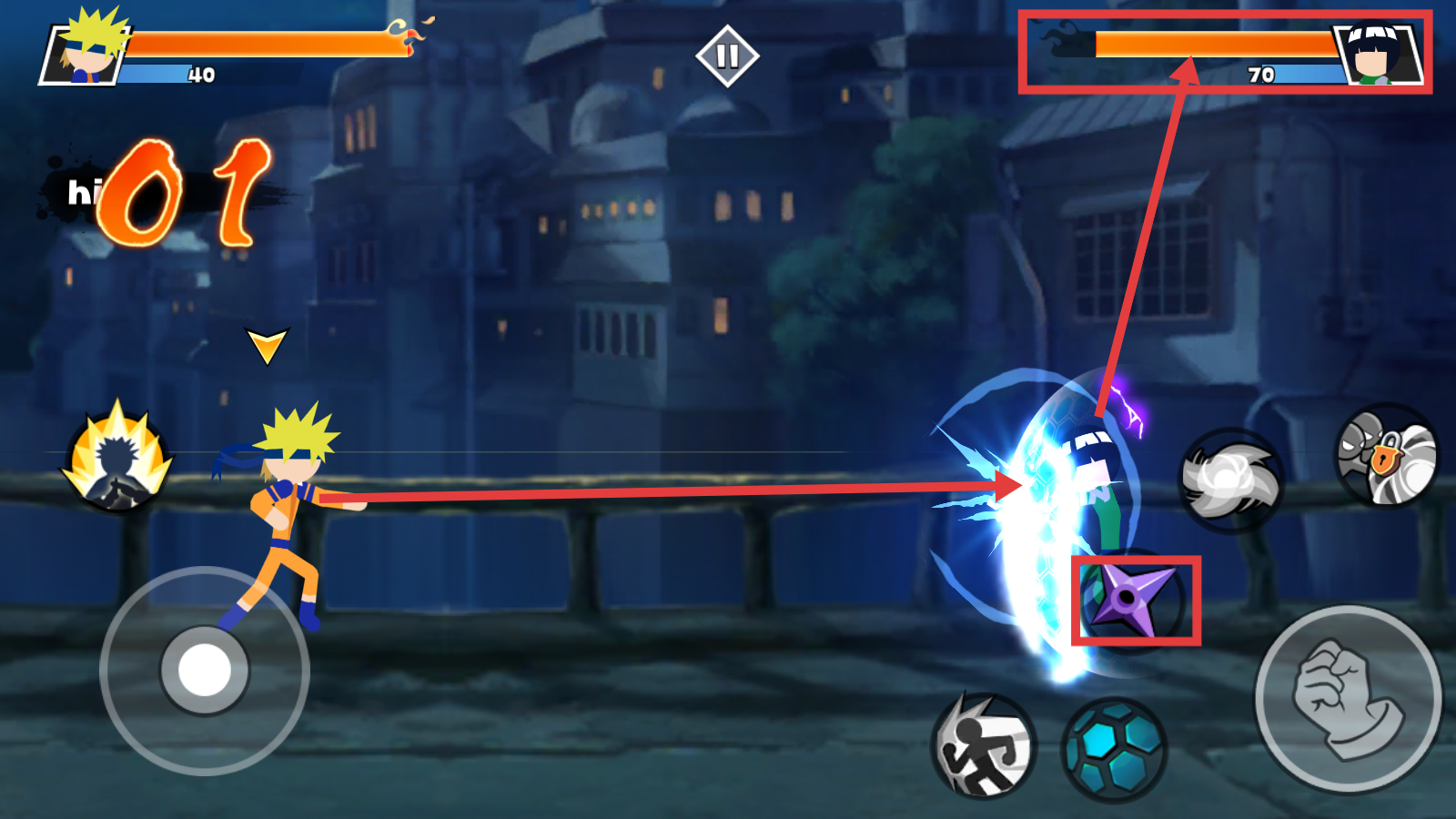 2、战斗中使用【手里剑】技能攻击敌人,关注敌方【HP-70】变化,连招输出以高效消耗其血量。