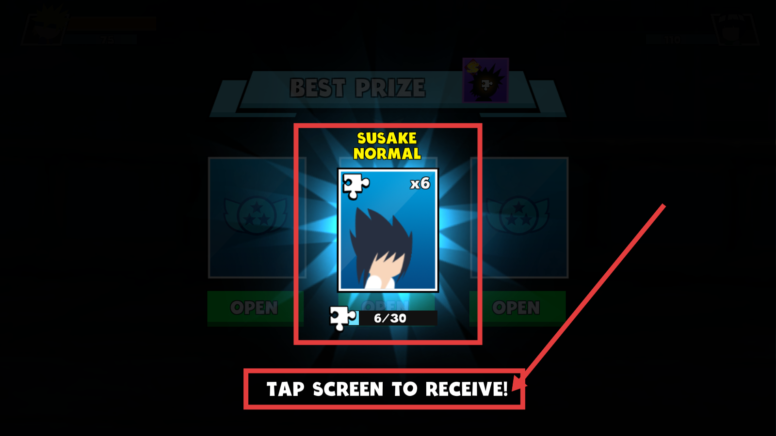 4、战斗结束后,点击【TAPSCREENTORECEIVE!】领取【SUSAKE-NORMAL-6/30】碎片,积累碎片可解锁新角色。