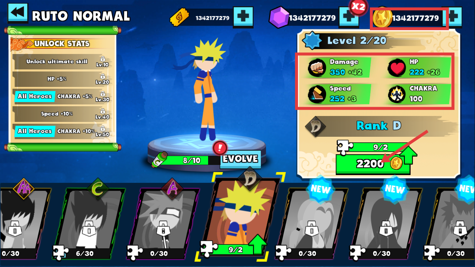 1、在【RUTO-NORMAL】界面,消耗【2200-金币】升级,提升【Damage-350+42】【HP-222+26】等属性,增强角色战力以应对后续战斗。