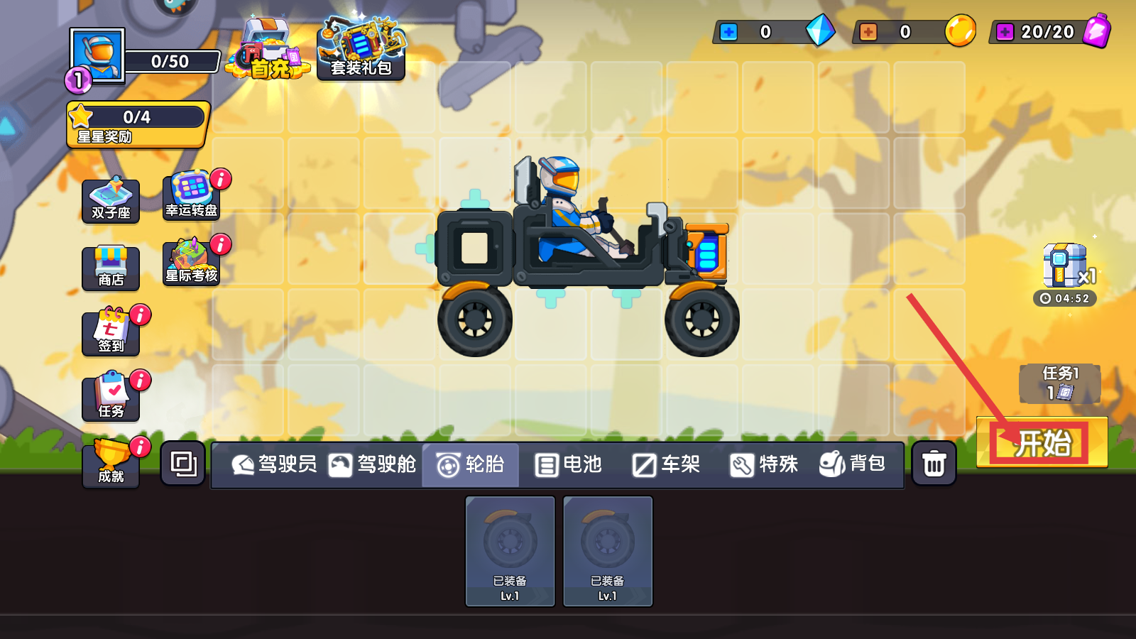 1、点击【开始】按钮进入游戏,可先确认车辆部件如轮胎、电池等组装状态,确保无误后开启关卡挑战。