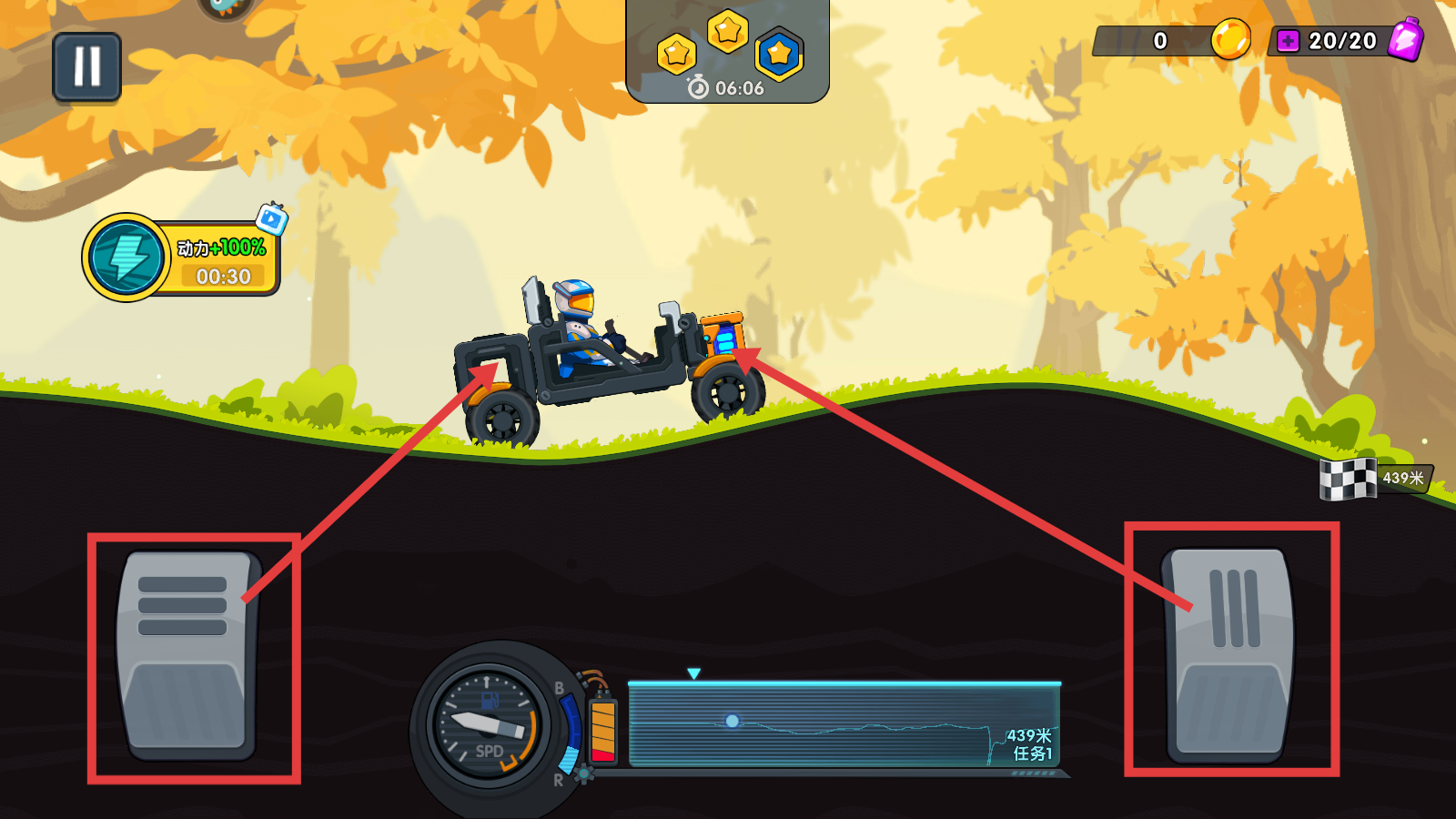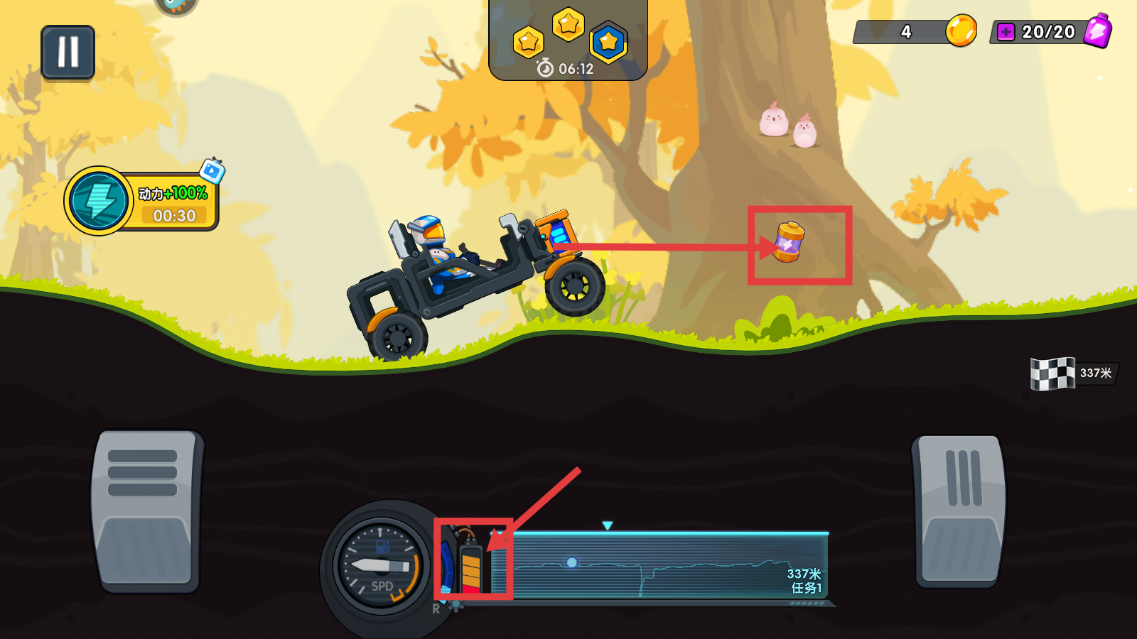 2、驾驶时操作左右踏板控制车辆,利用【动力+100%】加成提升速度,关注地形变化,平稳驾驶推进距离。