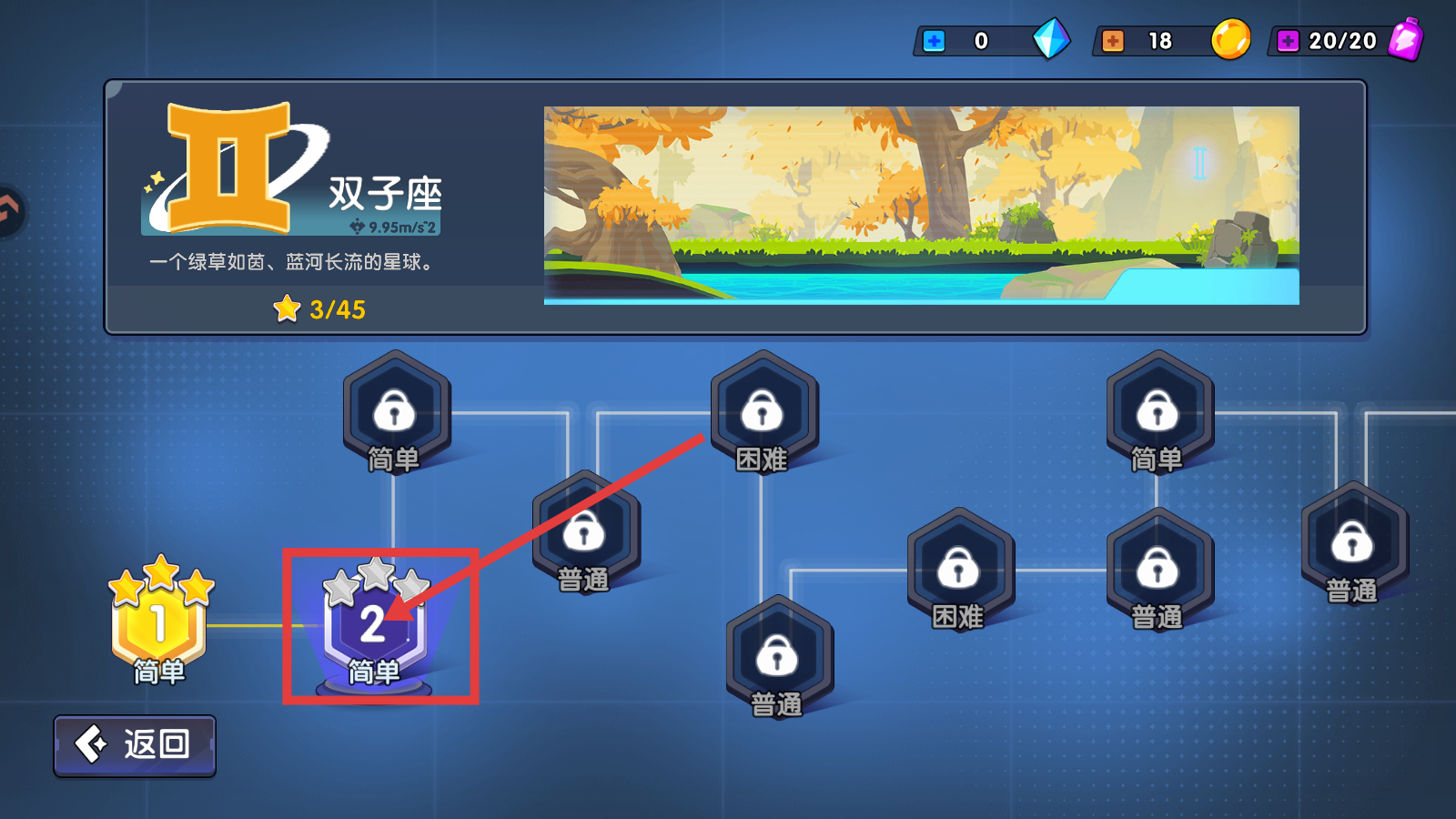 4、完成关卡后进入【双子座-第2关-简单】难度,继续挑战新关卡,积累星星奖励以解锁更多游戏内容。