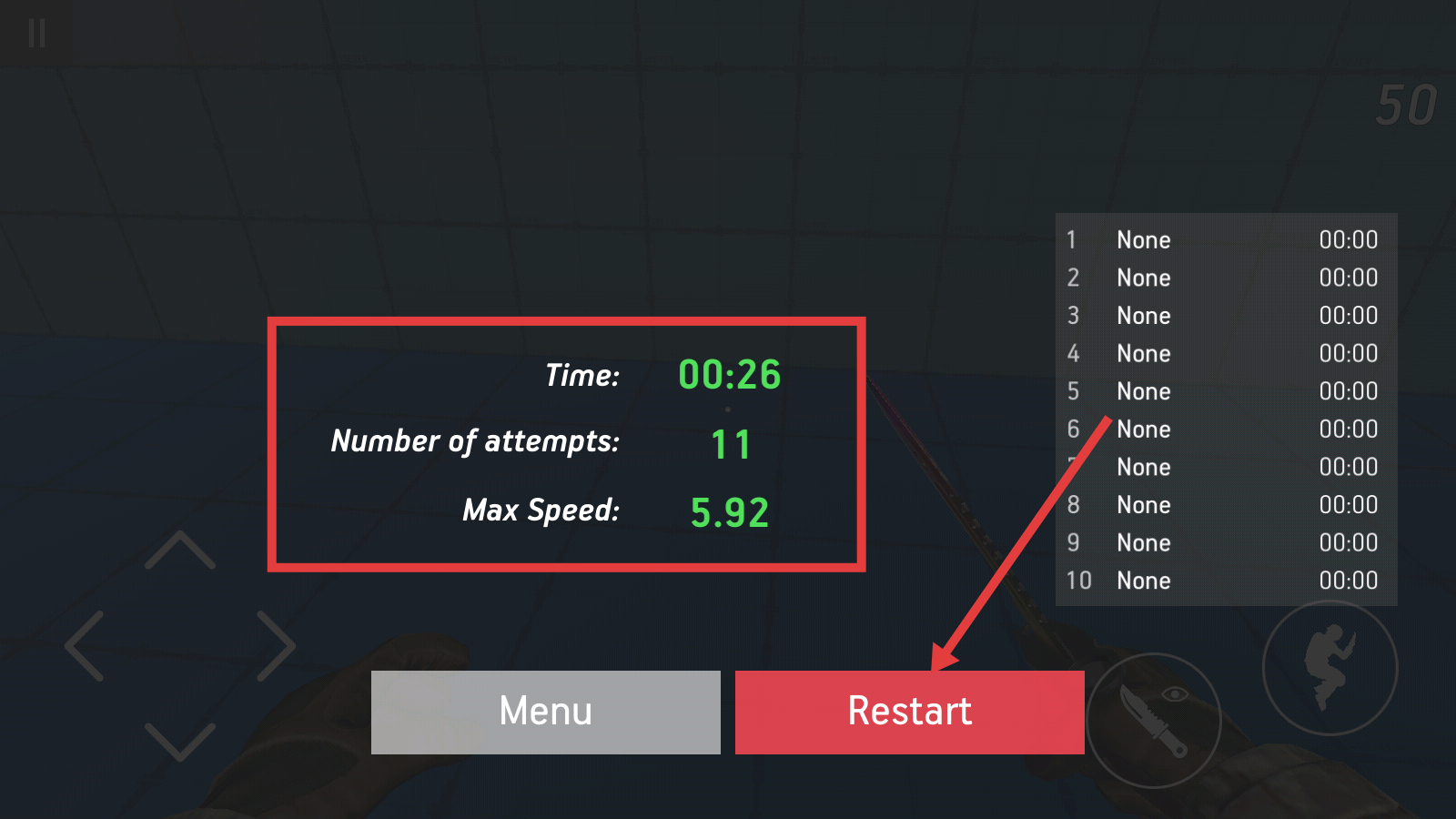 4、关卡结束后查看【Time-00:26】【Number-of-attempts-11】等数据,点击【Restart】重新挑战以提升成绩。