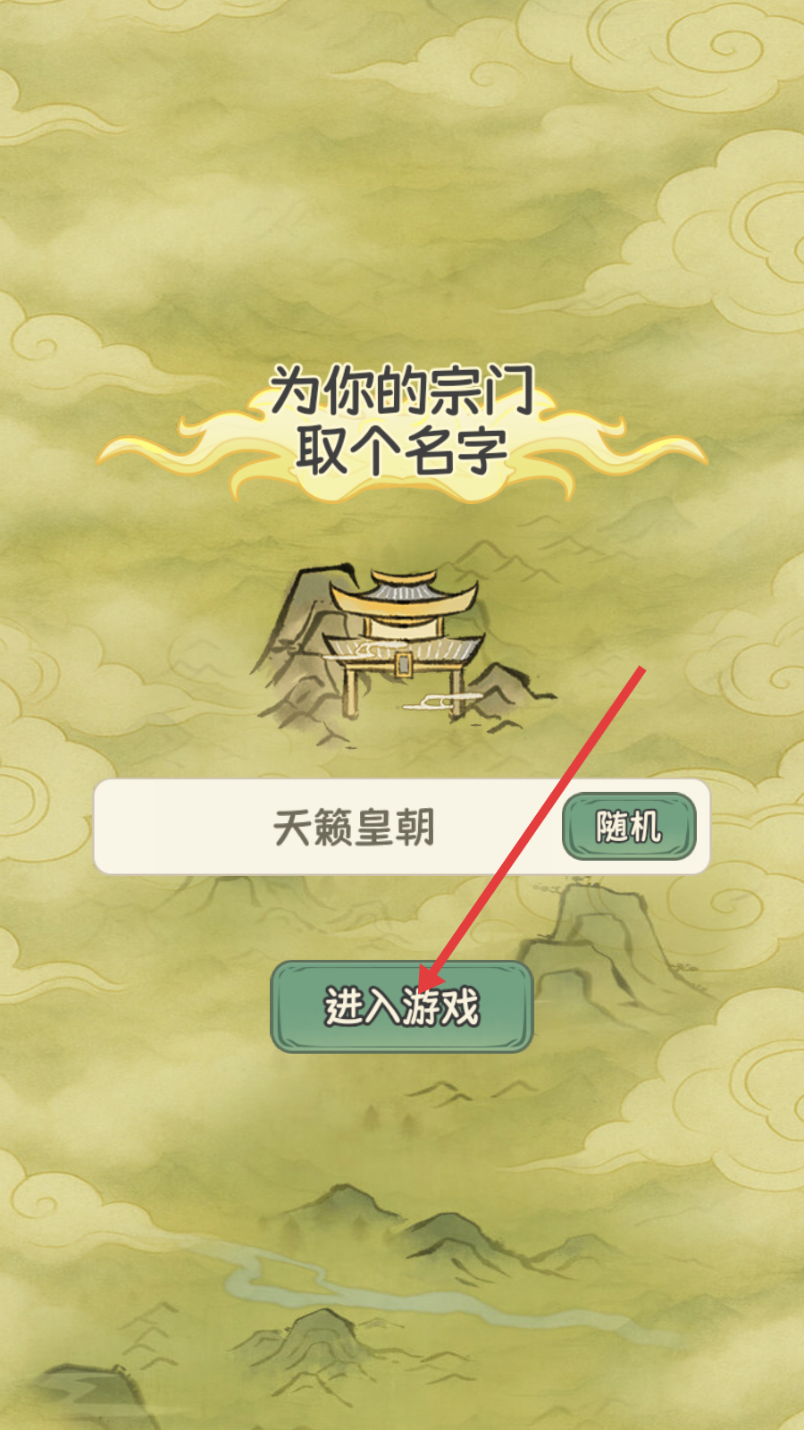 1、为宗门取名【天籁皇朝】后,点击【进入游戏】,开启宗门建设与发展之路。
