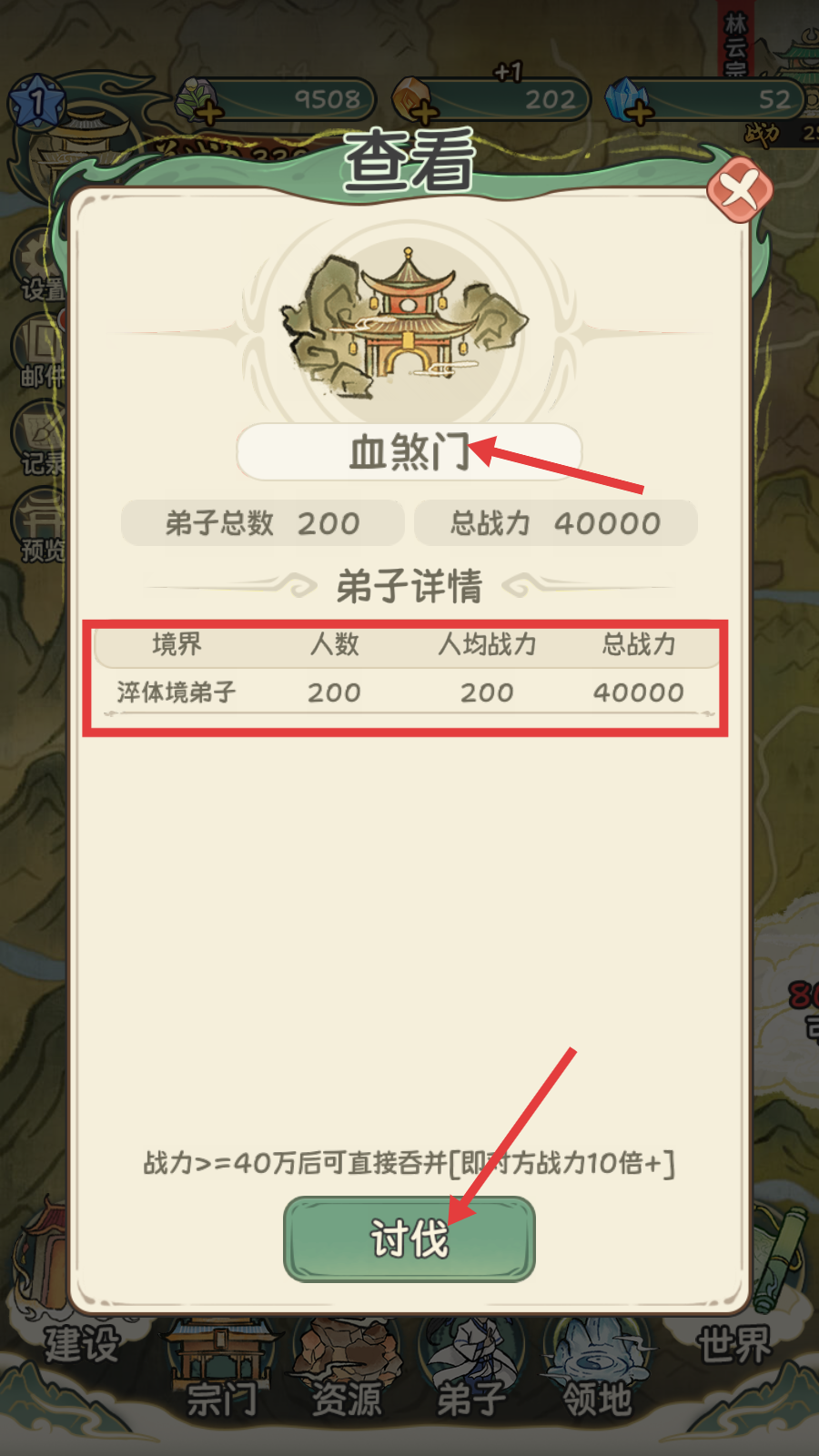 2、查看敌对宗门【血煞门】的弟子详情,其【淬体境弟子-200人-人均战力200-总战力40000】,点击【讨伐】准备发起进攻。