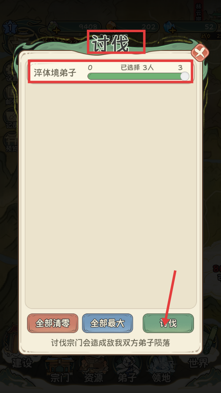 3、在讨伐界面选择【淬体境弟子-3人】,确认后点击【讨伐】,发起对敌对宗门的进攻。