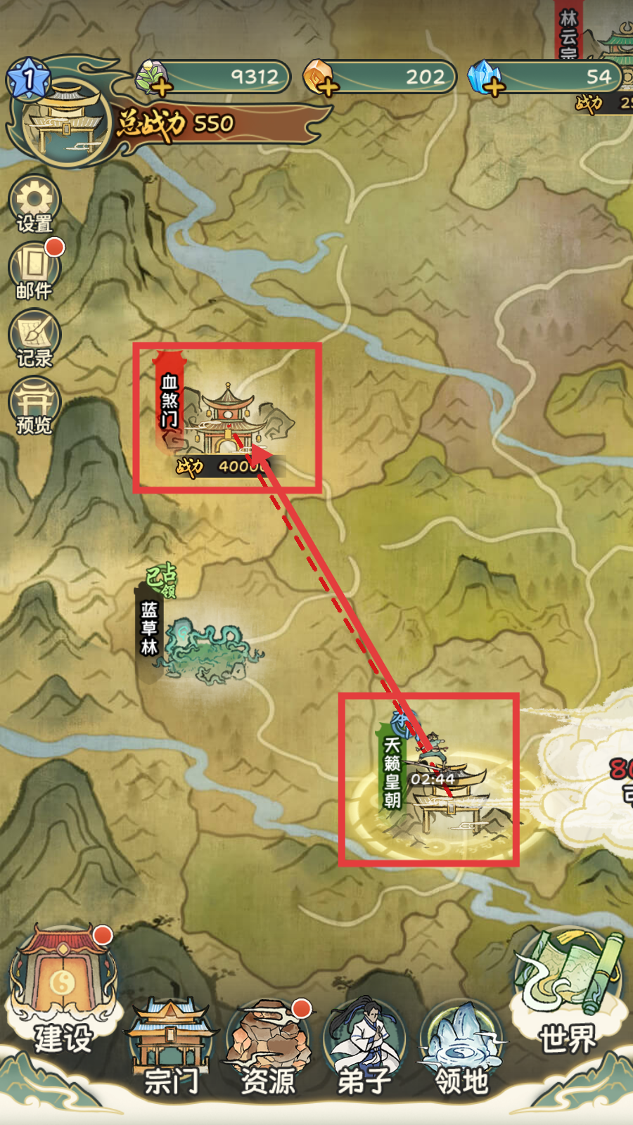 4、在地图上操作【天籁皇朝】讨伐【血煞门】,推进领地争夺,提升宗门战力与影响力。