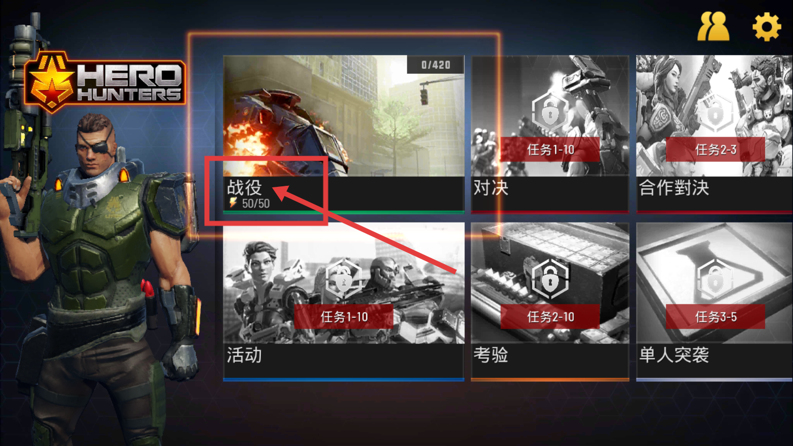 1、进入【Hero-Hunters】后,优先选择【战役-50/50】模式,跟随剧情推进解锁更多玩法,积累初期资源与经验。